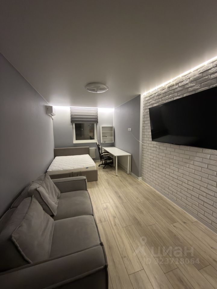 — Уютная комната с диваном, кроватью, рабочим местом, телевизором и гардеробной зоной