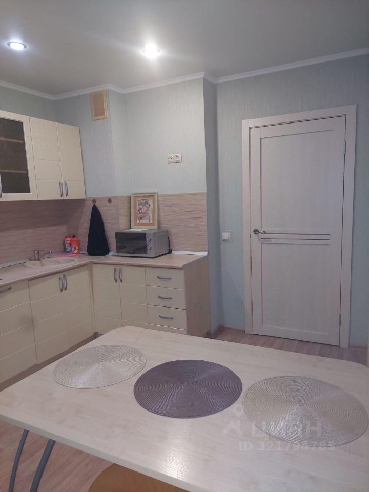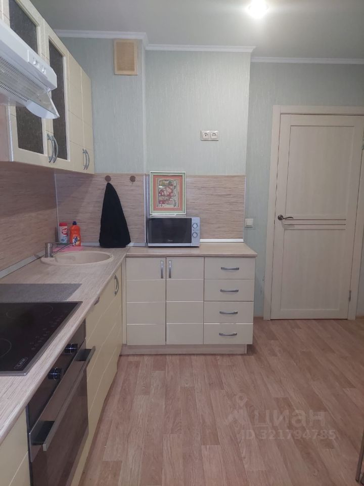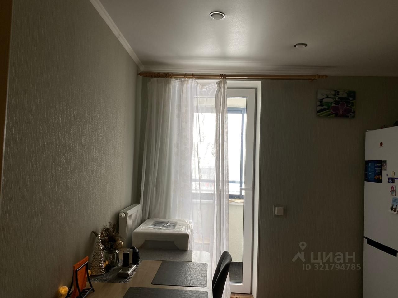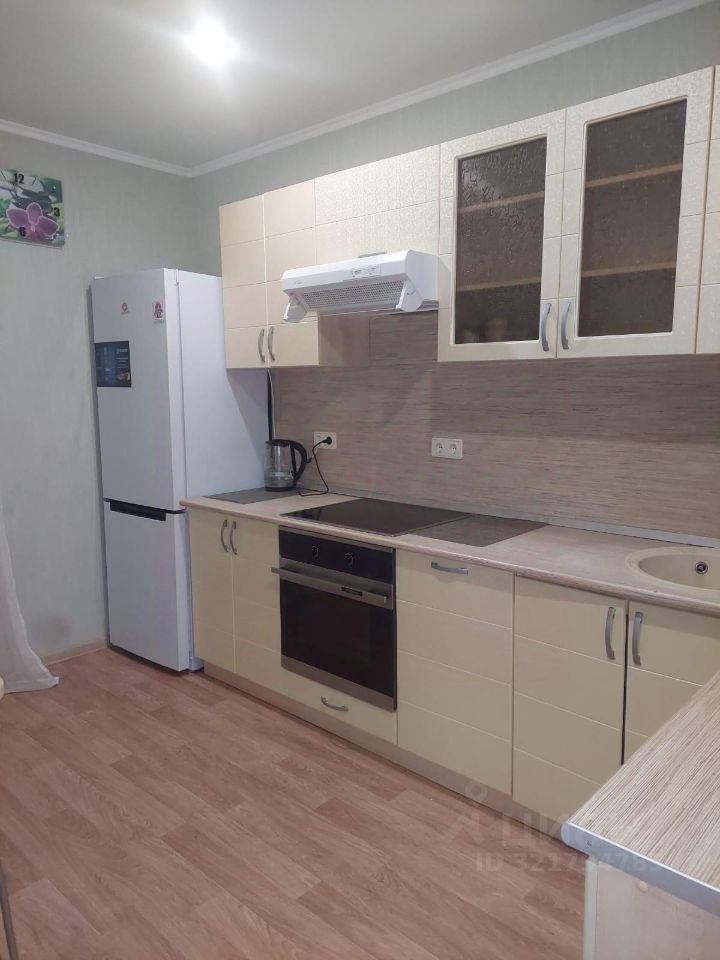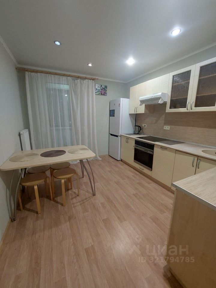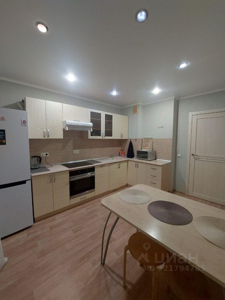 Кухонный гарнитур,варочная панель, холодильные 2-х камерный, стол, табурет(4), вытяжка, духовка,чайник. Выход на балкон. Кухня очень просторная.