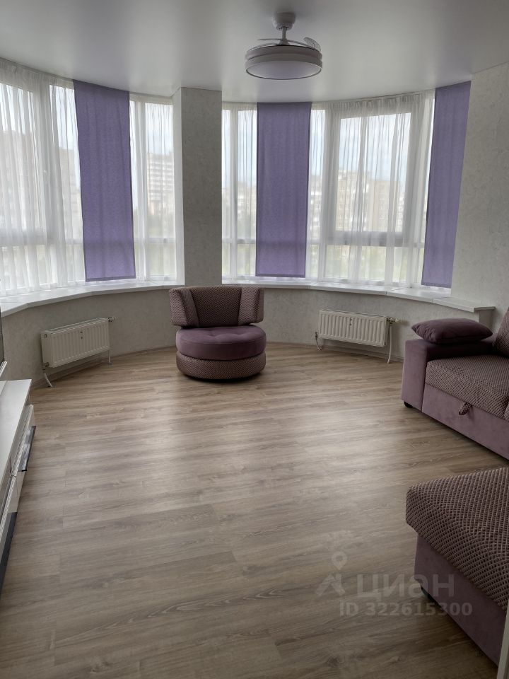 Квартира с отдельной гардеробной, лоджией и большим изогнутым панорамным окном в гостиной, которое наполняет пространство особой атмосферой.