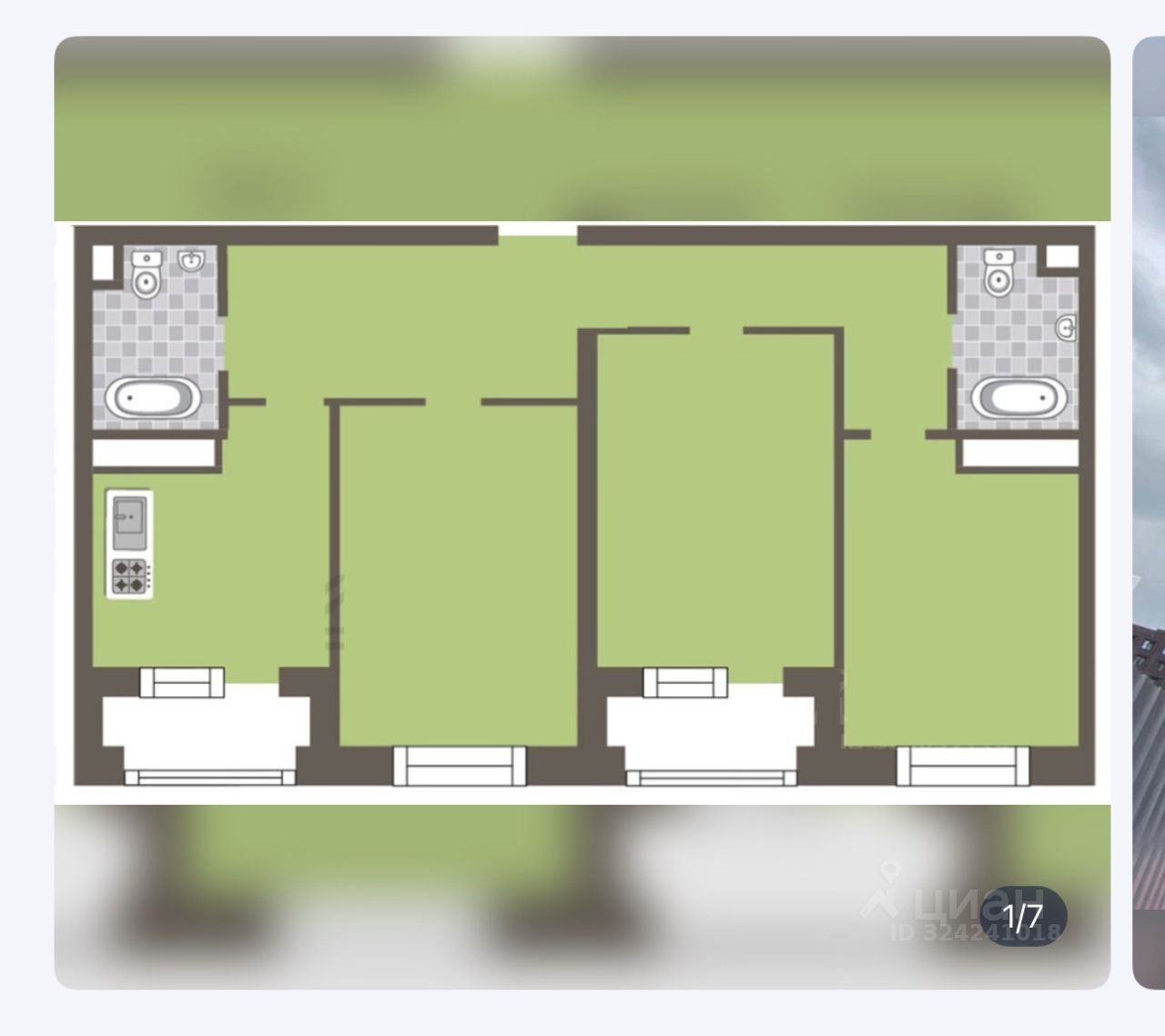 Два раздельных санузла с ванной и туалетом и два больших балкона.