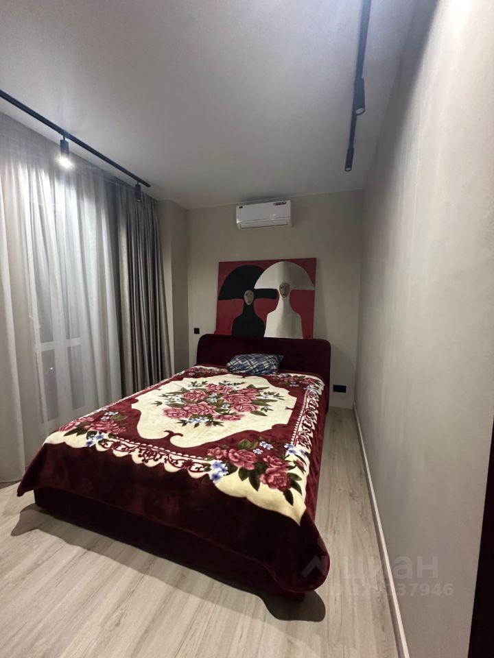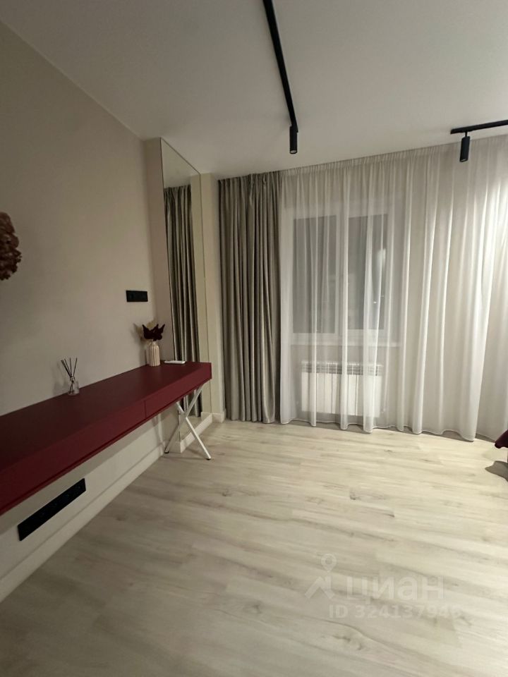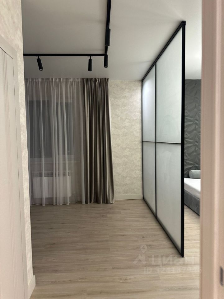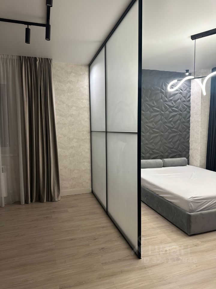 Первая комната, вход из гостиной. Кровать разделена с рабочей зоной полупрозрачной перегородкой, балкон, вход в гардеробную.