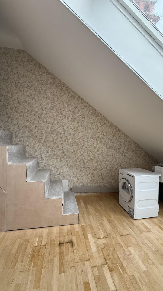 В комнате поменьше есть так же ещё подьем на небольшой этаж, там была размещена детская кровать раньше. Мы использовали эту комнату как гладильную зону.