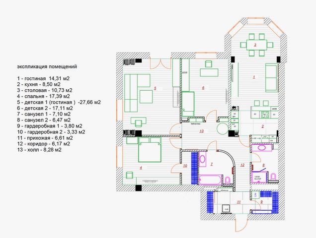 Общая площадь квартиры 141,3 кв.м. Удобная планировка: гостиная с балконом с колоритным видом на Замоскворечье, мастер-спальня с оборудованной гардеробной комнатой, детская спальня (или кабинет), кухня-столовая с живописным эркером, два просторных совмещенных санузла- один с ванной, другой с душевой, центральный холл с книжными полками, прихожая со встроенным гардеробом, хозяйственная комната с системой хранения и стирально-сушильной машиной. Встроенная кухня Nolte оснащена техникой Miele: посудомоечная машина, холодильник, вытяжка, кофемашина, варочная панель, подогрев полов. Проведен высокоскоростной интернет. Установлена сплит-система с кондиционированием и вентиляцией для каждой комнаты отдельно. Установлены микробиологический и механический очистители воды.