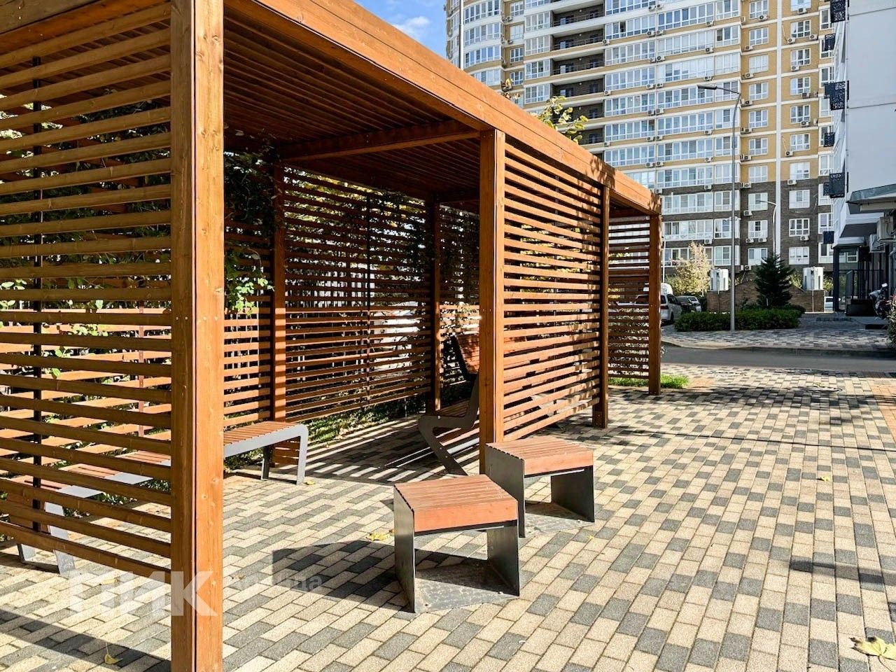 На закрытой территории двора несколько детских и спортивных площадок, фонтаны, кафе и кондитерские, салоны СПА, несколько точек ОЗОН и ВБ.