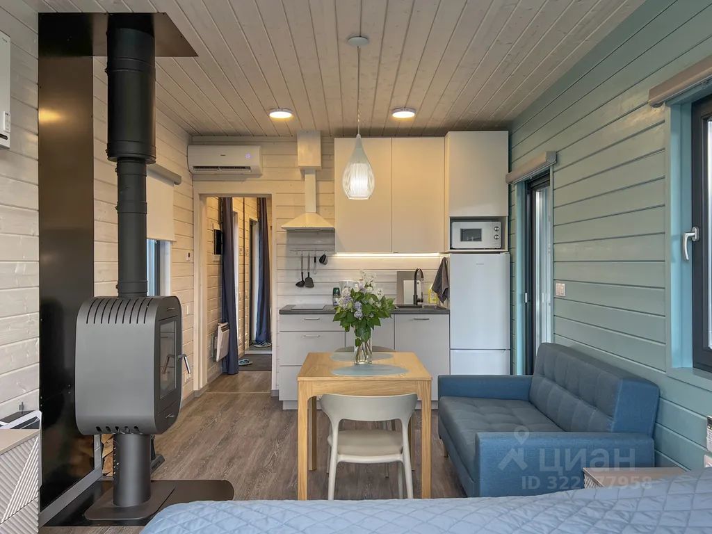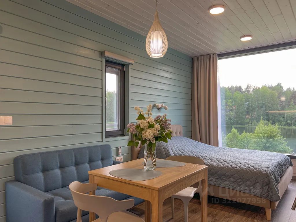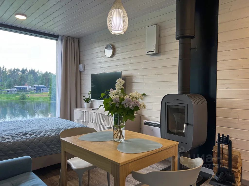 Новый дом-студия с шикарным панорамным окном и видовой сауной. Дом подходит для размещения 2 взрослых (кровать 160см) и 1-2 детей (диван раскладывается, 120см).