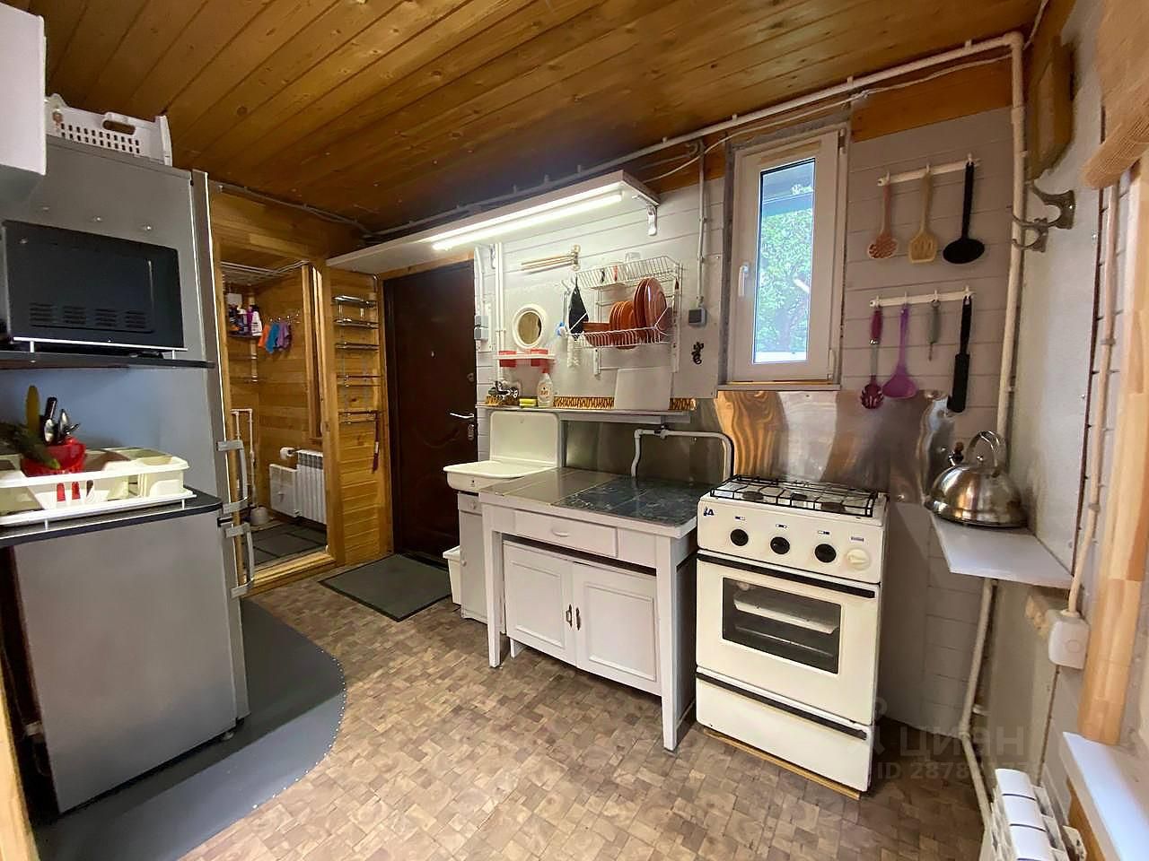 Кухня в виде террасы, холодильник, плита газовая и индукционная, микроволновка + обеденный стол;
