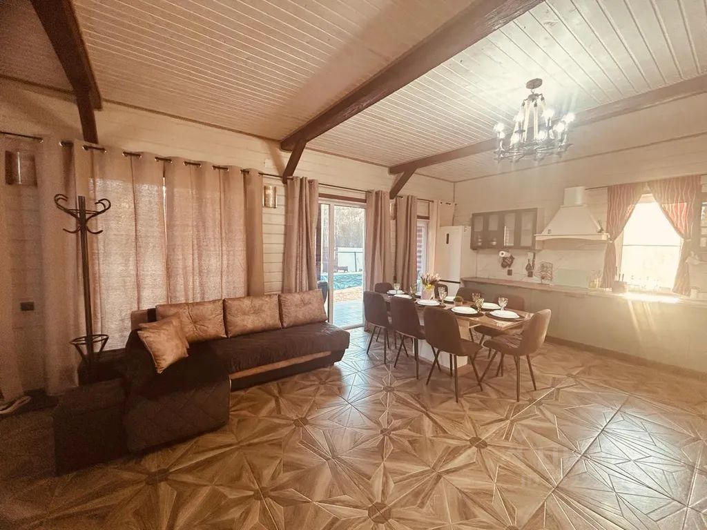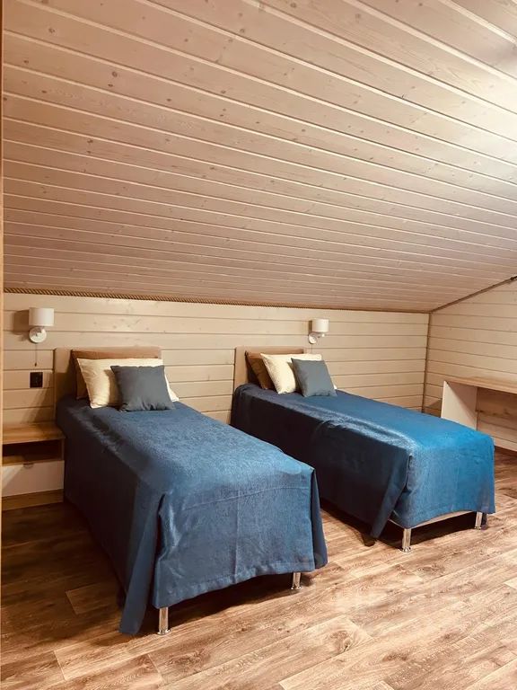 Этот уютный четырёхкомнатный дом (4 отдельных одноместных кровати, 1 кровать состоит из 2х односпальных кроватей, 1 кровать двуспальная) высококачественная облицовкой из дерева, дом расположен на участке в 23 сотки.