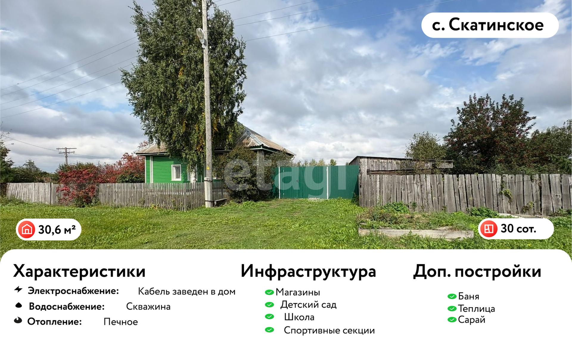 Продается дом в селе Скатинском Камышловского района по улице Северная. Общая площадь дома составляет 30,6 кв.м. Ключевым преимуществом объекта является земельный участок площадью 30 соток, полностью межеванный и готовый к использованию. Категория земель — земли населенных пунктов, разрешенное использование — для ведения личного подсобного хозяйства. Участок отличается высокой степенью освоения: здесь расположены теплица длиной 8 метров, баня, сарай для дров, а также разнообразные насаждения, включая яблони, вишню, малину, смородину, крыжовник и клубнику, что обеспечивает потенциал для автономного ведения хозяйства.