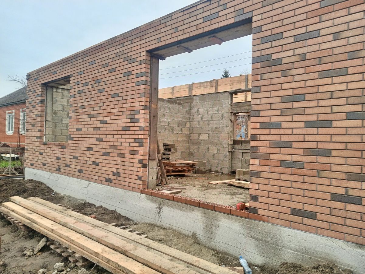 - Надежная конструкция из блоков и облицовочного кирпича обеспечивает прочность и долговечность строения.