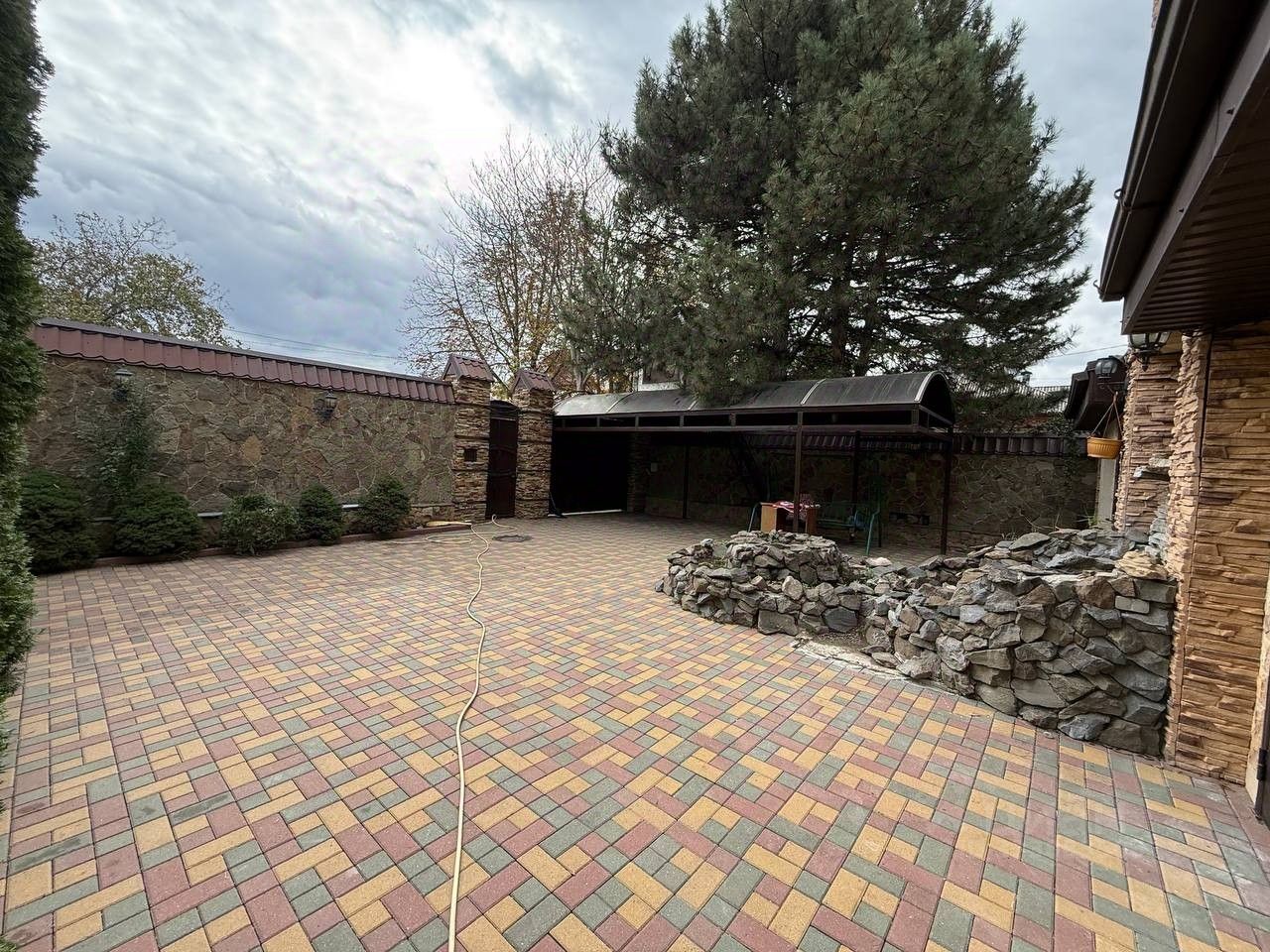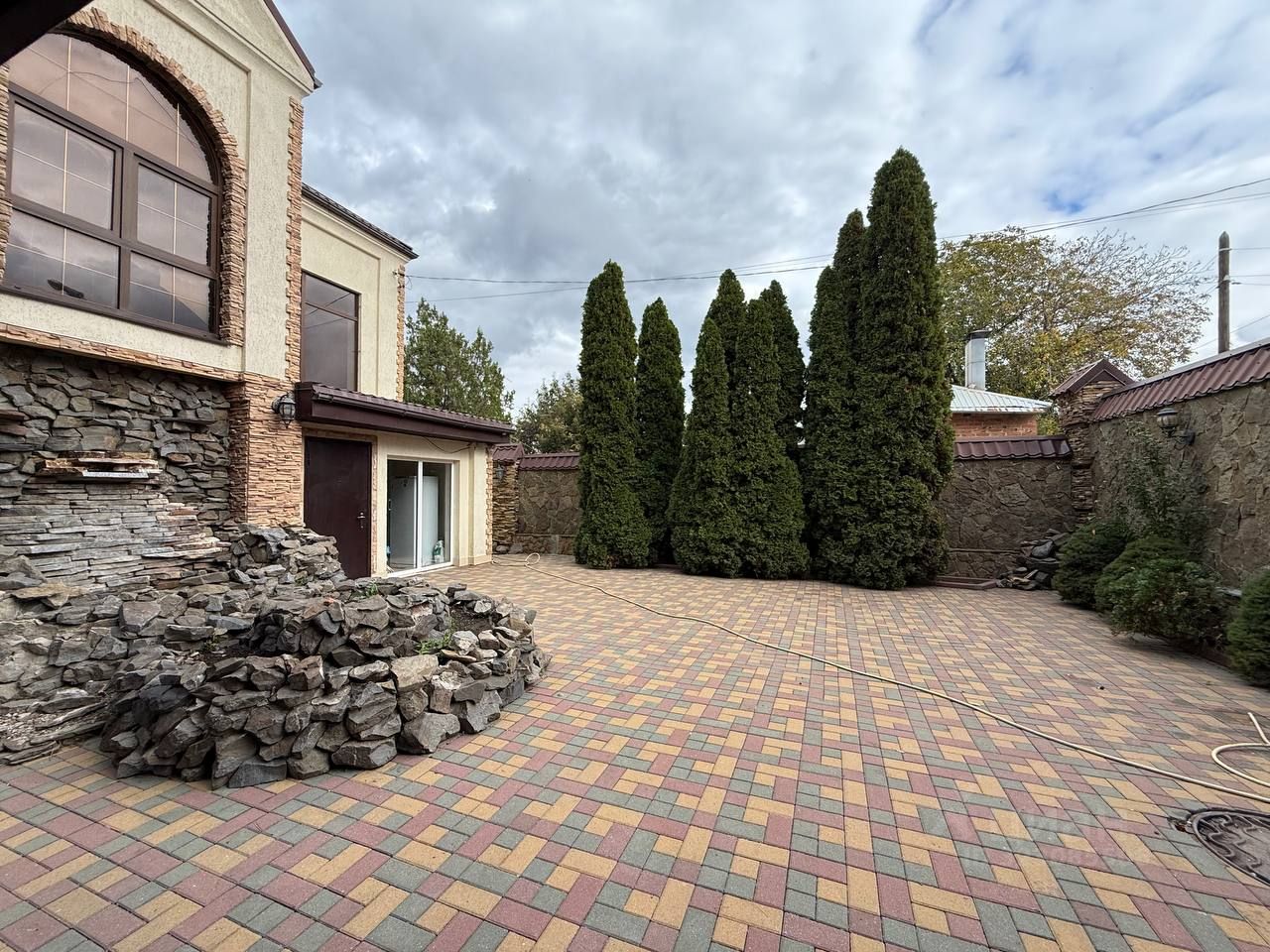 Территория участка и придомовой территории облагорожены, во дворе высажены туи, двор выложен плиткой, есть зоны отдыха. На придомовой территории предусмотрена парковка.