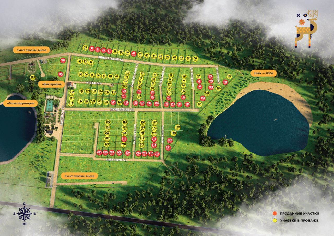 Поселок расположен в живописном месте в окружении вековых сосен и лесных озер