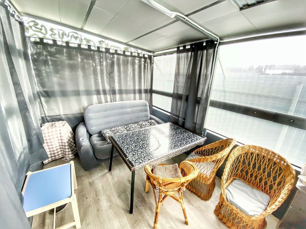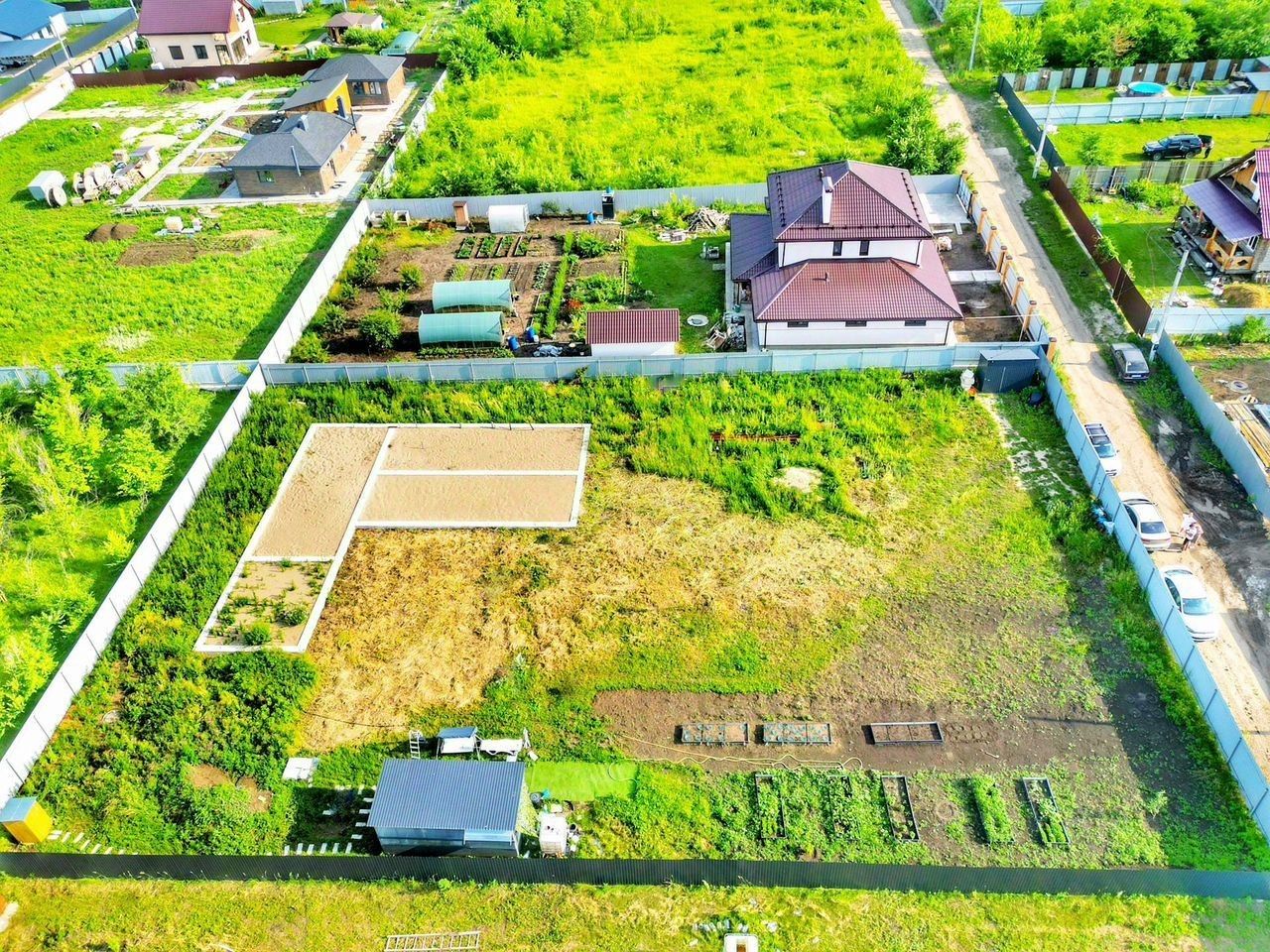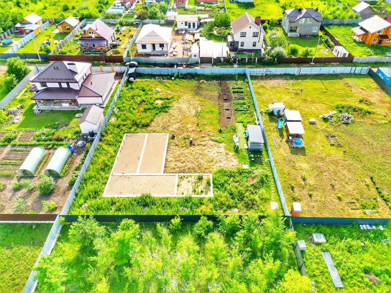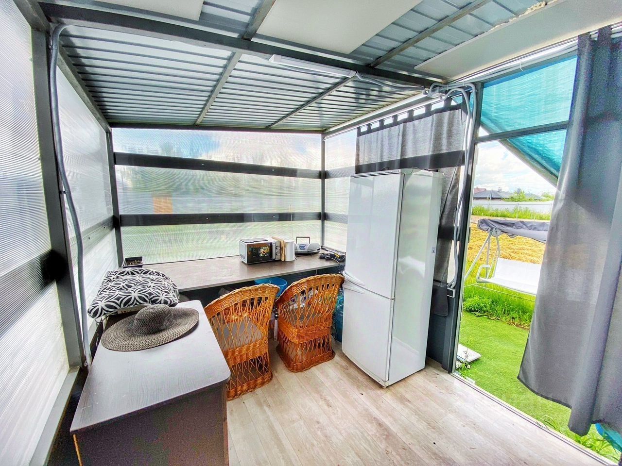 Возведен хозяйственный блок 4*3 м² и беседка 6*3 м², переносные. Свет проведен, установлены мебель и техника (холодильник, микроволновая печь).