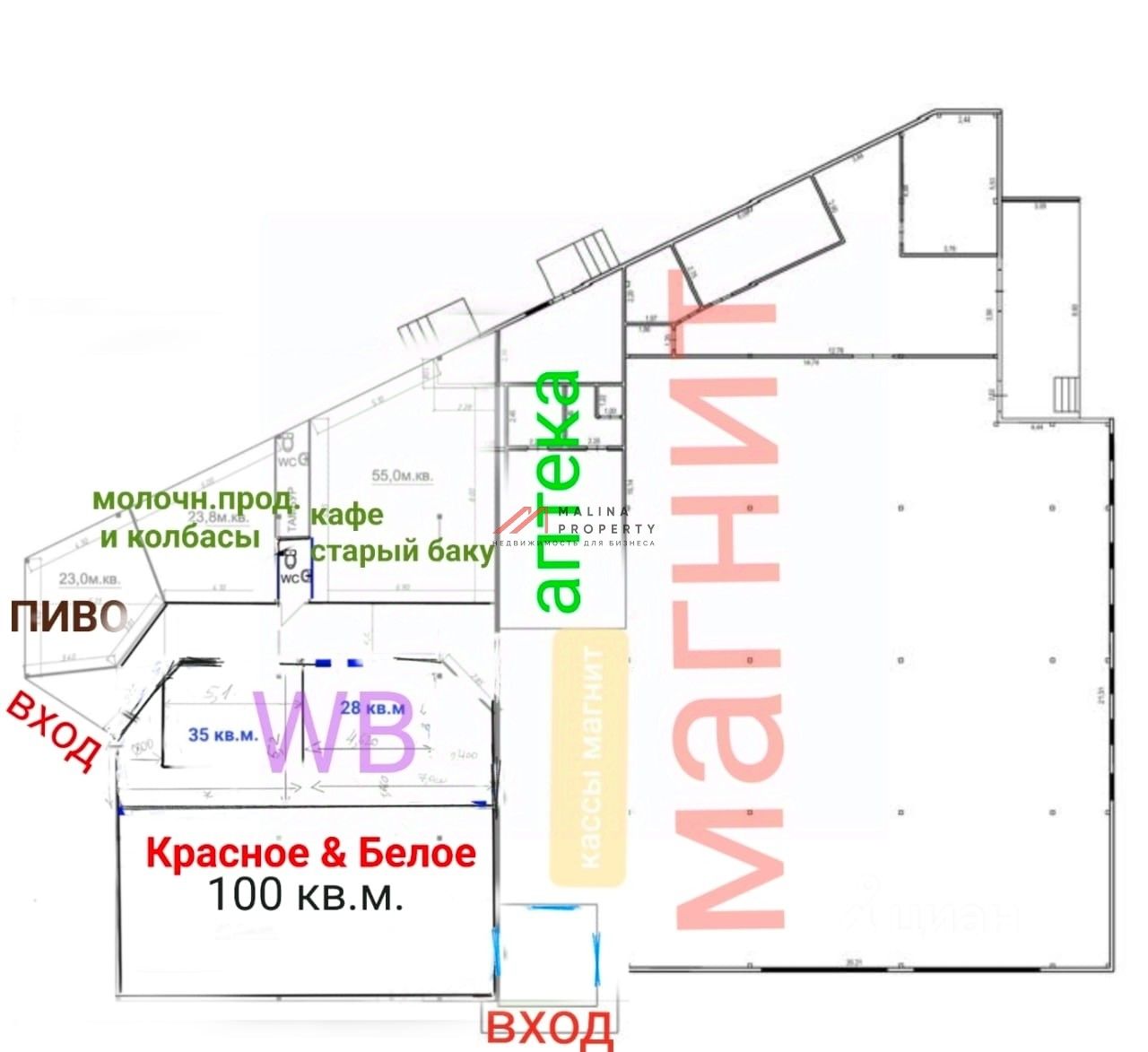 Арендаторы: супермаркет "Магнит", алкомаркет "Красное и Белое", пункт выдачи WB, кафе, отдел сыр и колбаса, табак, пивной магазин и три павильона с арендаторами.