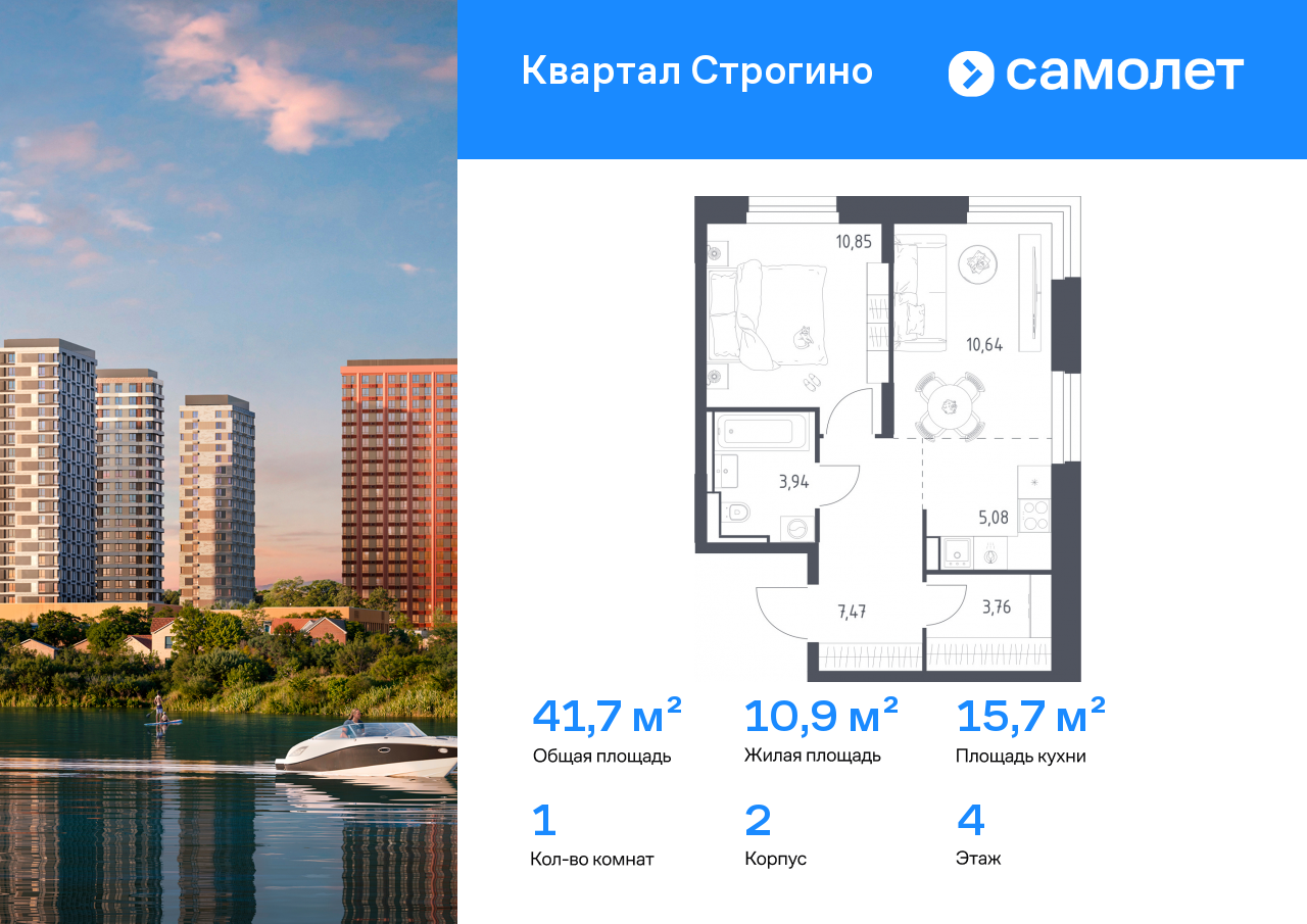 Строим кварталы для жизни с заботой о будущем. Предлагается 1-комнатная квартира комфорт-класса 41,74 кв.м в корпусе 2 на 4 этаже, в ЖК «Квартал Строгино»