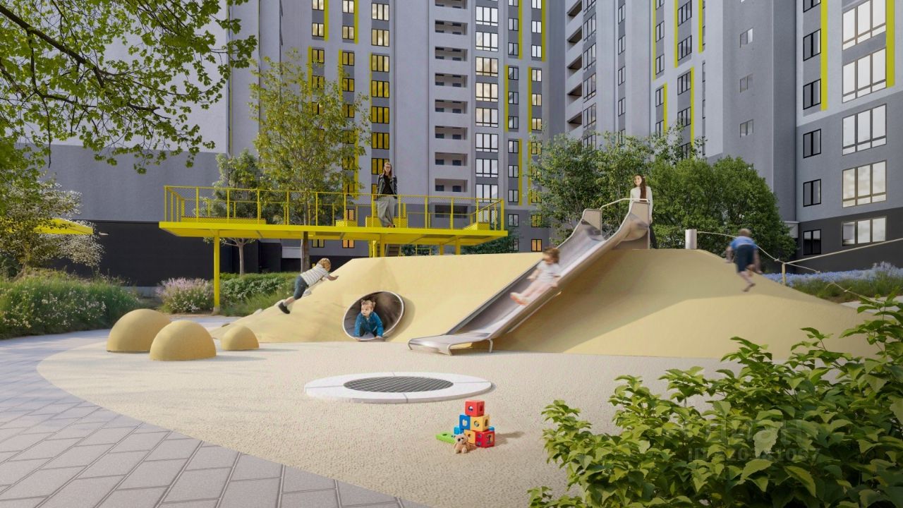 Концепция благоустройства сделана по специальному архитектурному проекту, с малыми архитектурными формами из металла с желтыми цветовыми акцентами, гармонирующими с фасадом домов. Для детской площадки предусмотрены игровые комплексы из натурального дерева в эко-стиле. Предусмотрено продуманное озеленение по дендроплану с автополивом и разноуровневое наружное освещение.