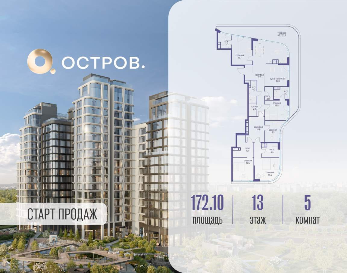Продаётся квартира от застройщика: общая площадь 172.10 м, жилая 62.60 м, кухня 34.80 м, 13-й этаж, жилой квартал «Остров 12», корпус 3 (секция 1) . Срок сдачи: 1 квартал 2029 года.