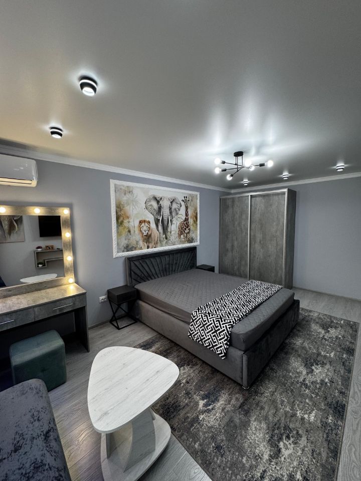 Шикарная новая кровать , новая мебель и идеальная чистота, все необходимое в квартире есть:постельное белье, полотенца, халаты, бытовая техника, чай, кофе.