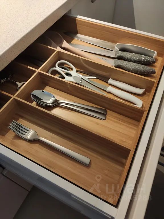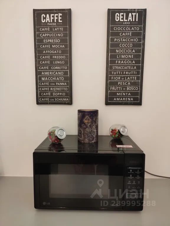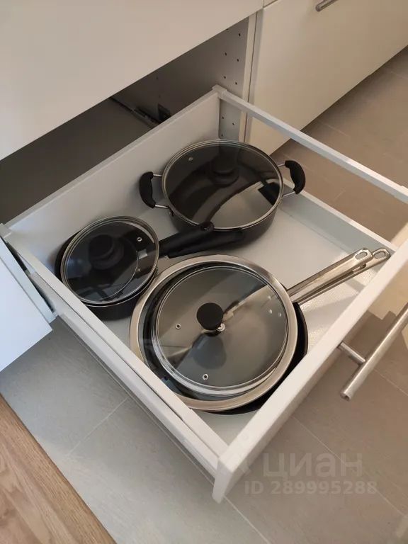 На кухне есть холодильник, микроволновая печь, электрический чайник, индукционная варочная панель, кухонная посуда и столовые принадлежности.