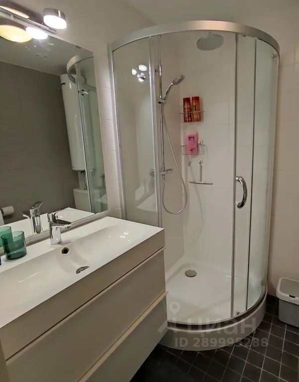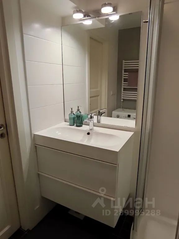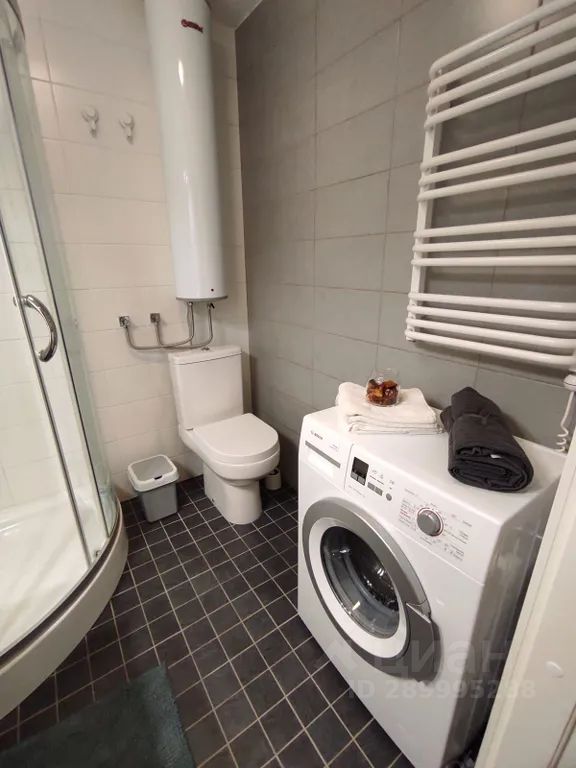 Ванная комната оборудована душевой кабиной. Имеется электрический водонагреватель на случай отключения горячего водоснабжения. В ванной есть стиральная машина и средства для стирки белья. Имеется электрический полотенцесушитель. Сушилка для белья находится на балконе.