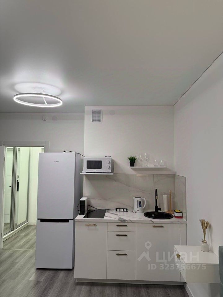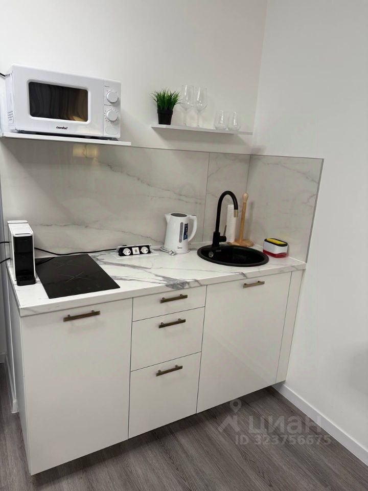 Полностью оборудованная: варочная панель на 2 конфорки, микроволновка, холодильник, чайник, кофемашина