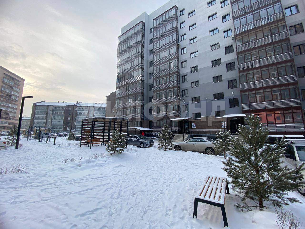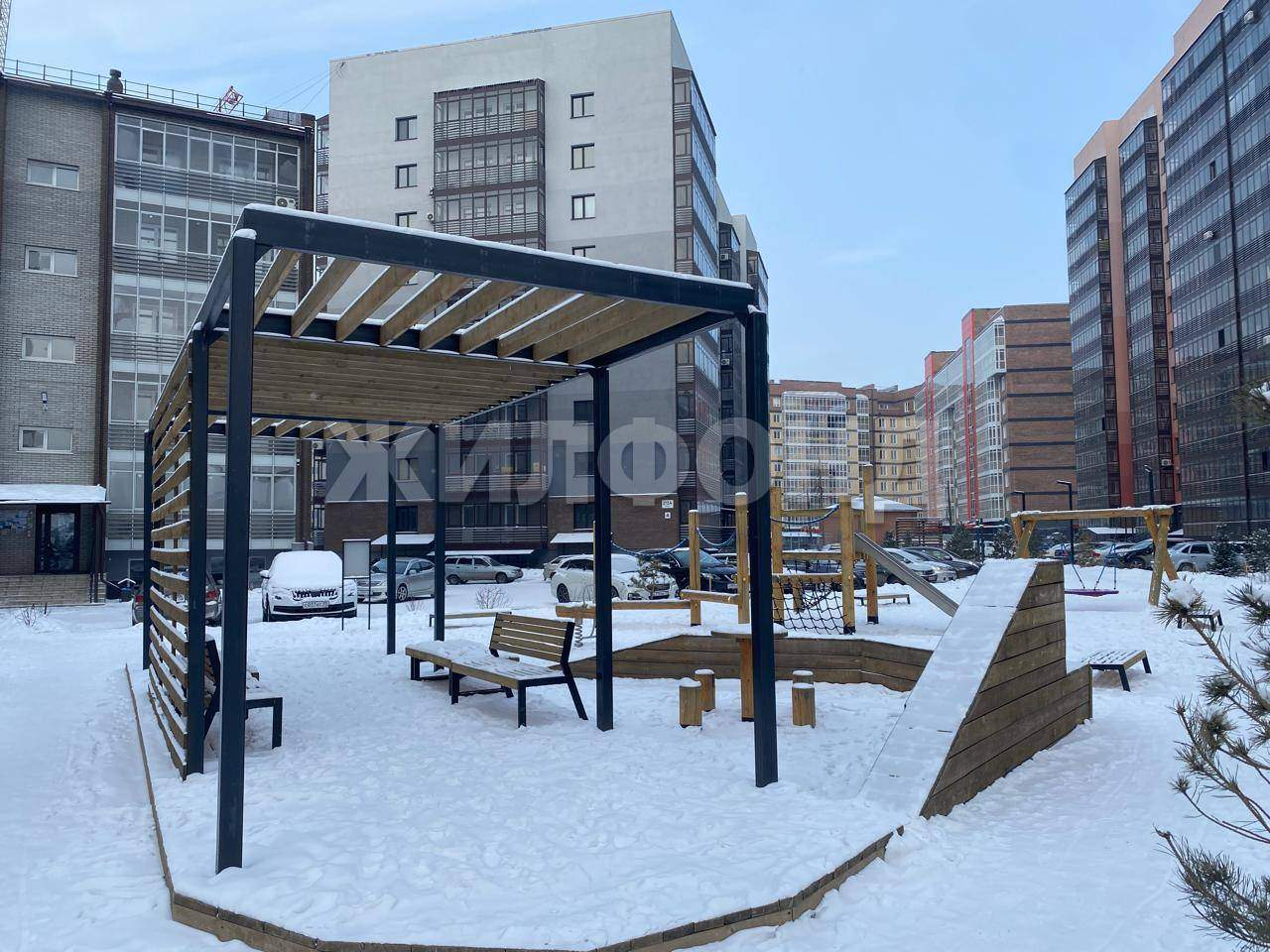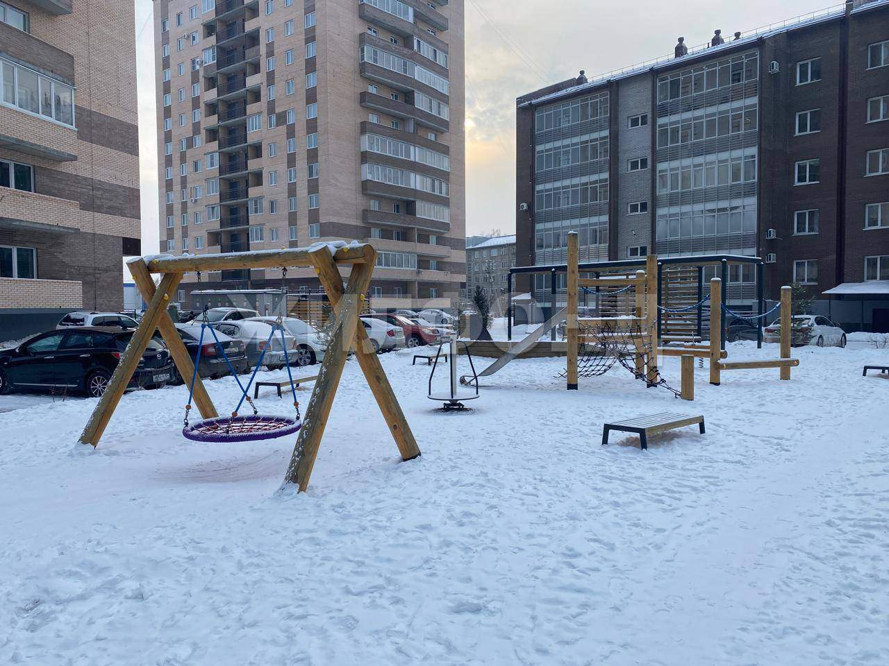 Территория дома оборудована парковкой , во дворе игровая площадка оснащена мягким покрытием.