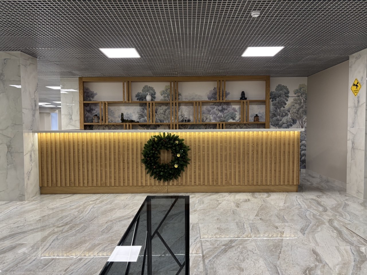 - В холле расположено лобби со стойкой ресепшн и лаунж зоны. При входе предусмотрено место хранения детского транспорта и колясок