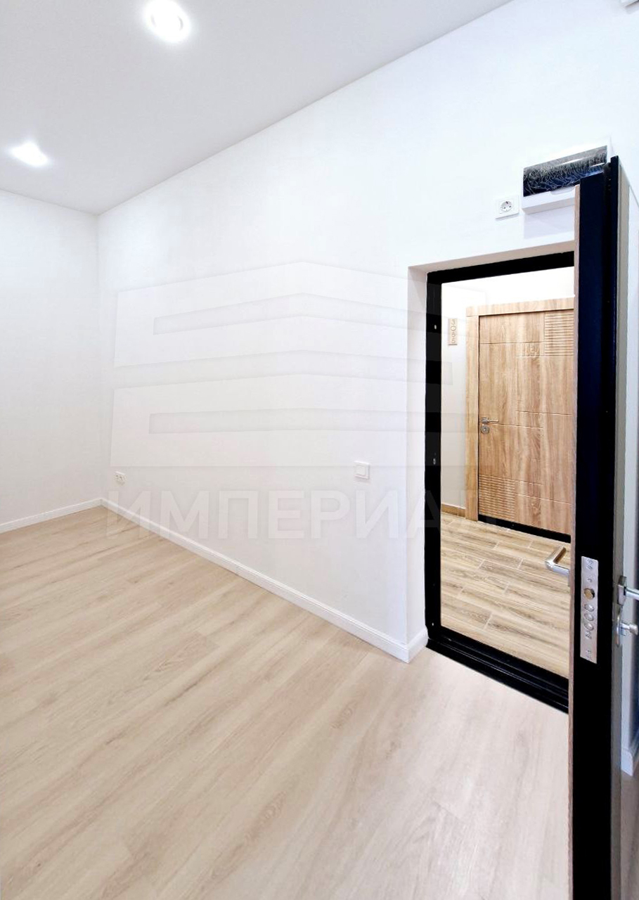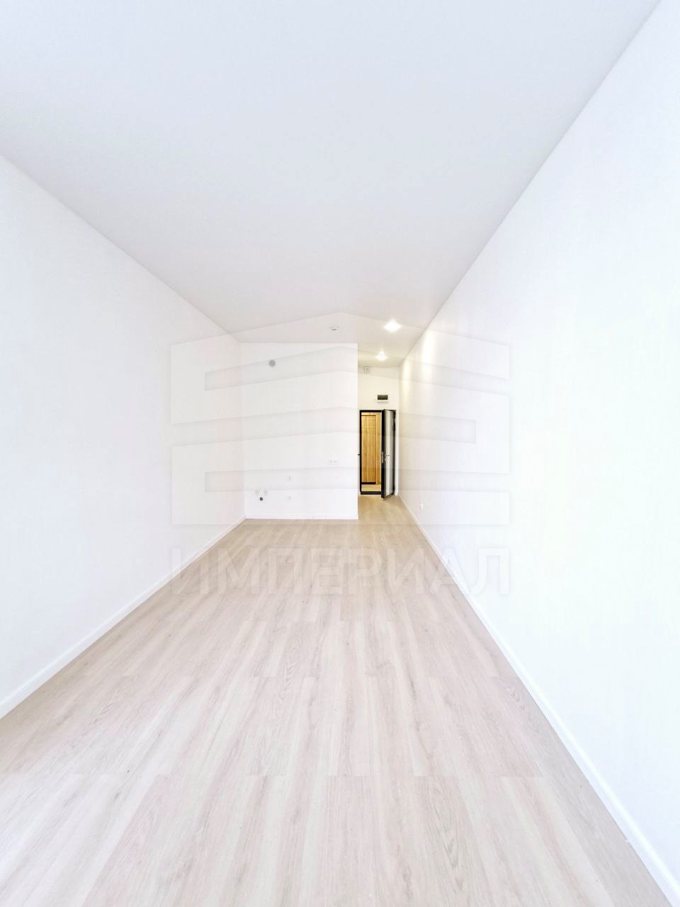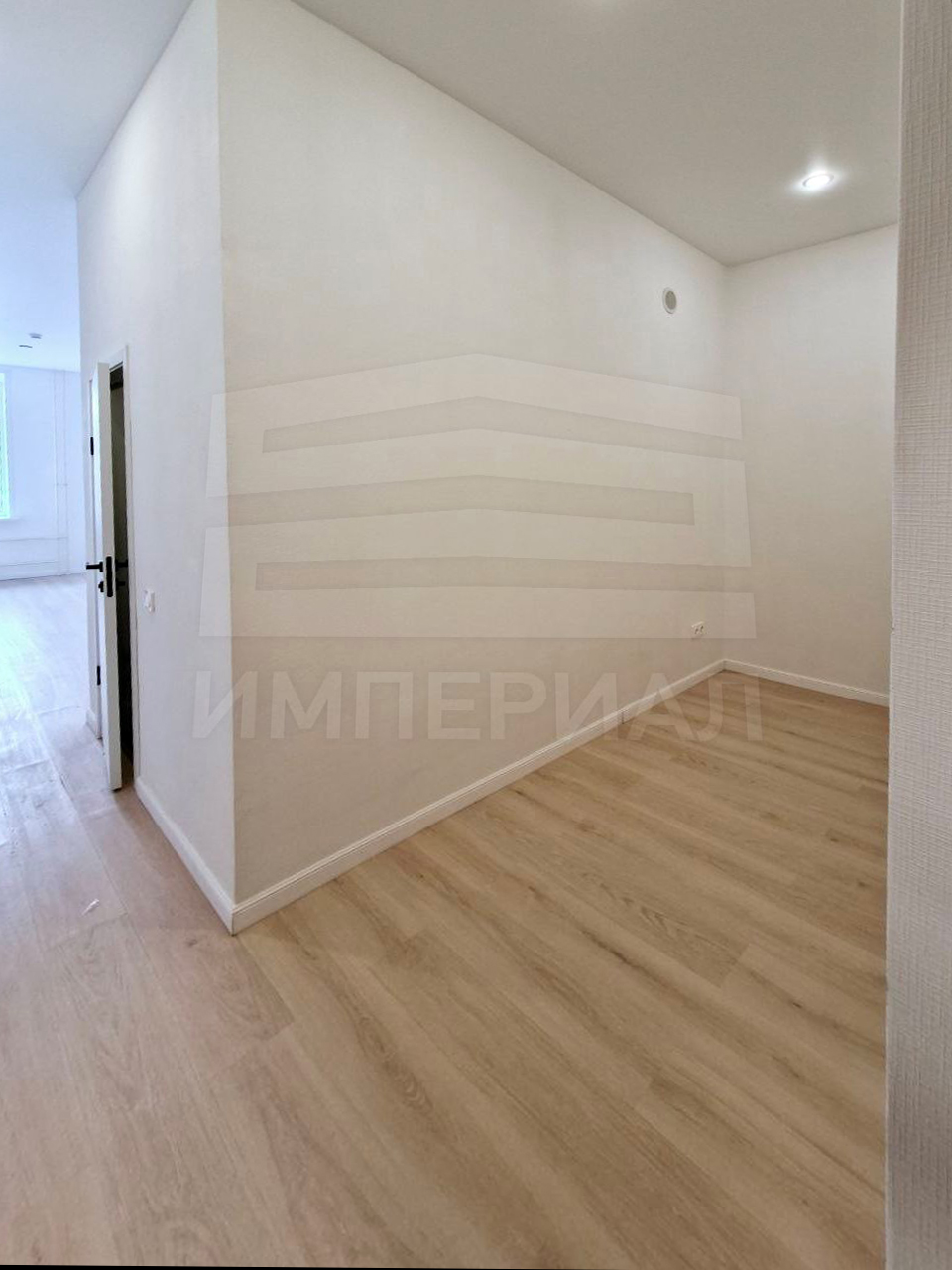 На стенах поклеены обои под покраску, на полу постелен ламинат с плинтусами и откосами. Есть вытяжная вентиляция в санузле и на кухне, выходы хв/гв, место под раковину на кухне. Кроме того, в помещениях уже есть выключатели освещения, розетки для бытовой техники и роутера, а также сделаны закладные для оптоволокна для интернета.