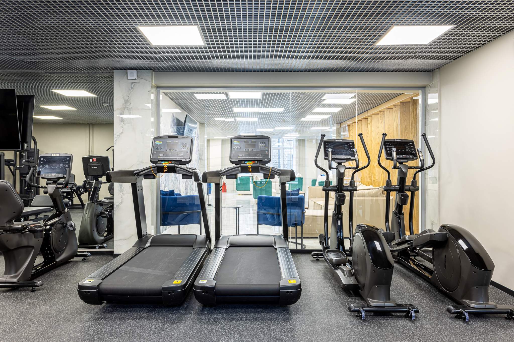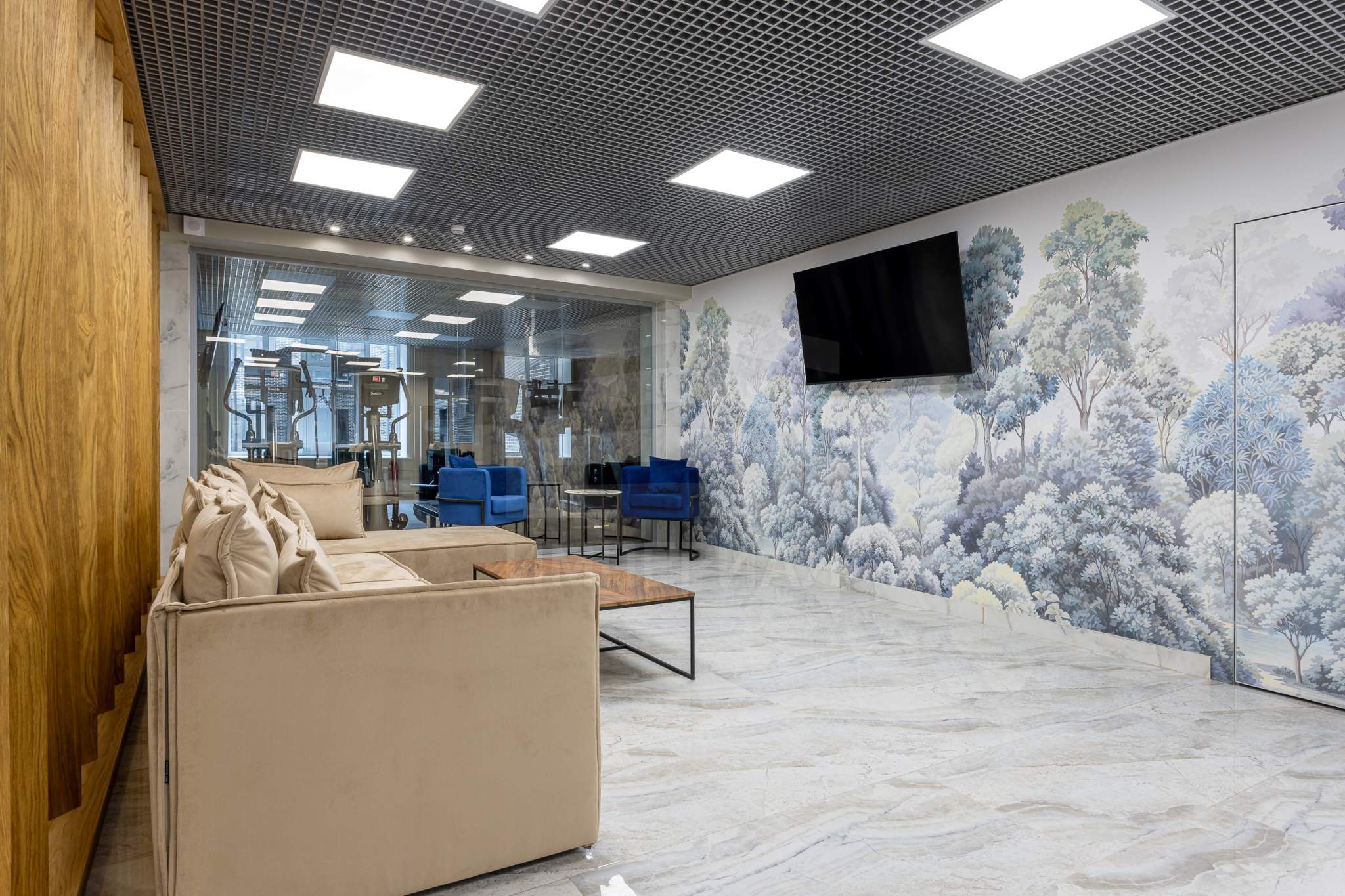 При входе резиденты и их гости попадают в стильное лобби с ресепшеном, а также лаундж-зону. Стильный интерьер в светлых тонах создает домашнюю уютную атмосферу и в то же время подчеркивает статус комплекса.