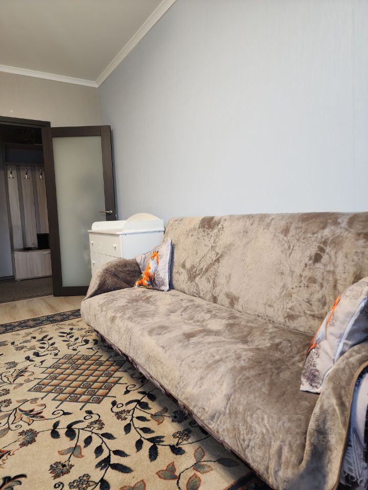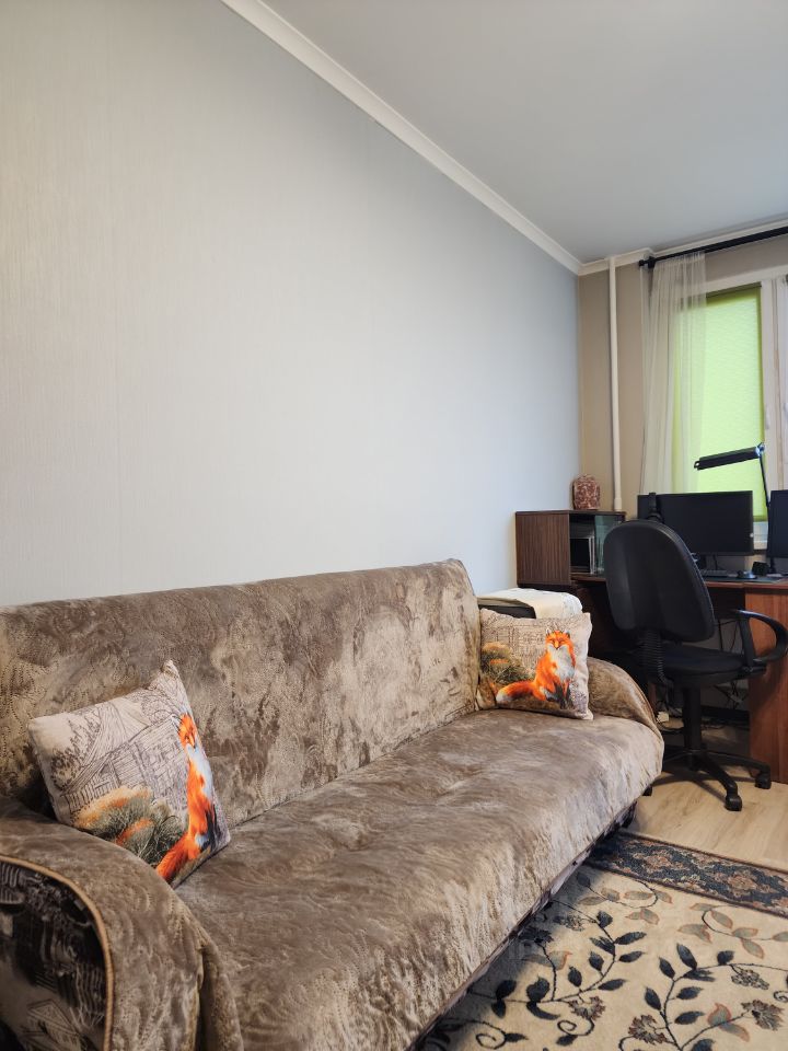 Уютная жилая комната и большой встроенный шкаф с зеркальными дверьми в прихожей во всю стену. Новый диван, новая двуспальная кровать с матрасом, тумбочки также остаются новым владельцам. Раздельный санузел. Балкон с теплым полом. Высокоскоростной интернет МТС. Соседи - спокойные, проблем нет. В подъезде консьерж.