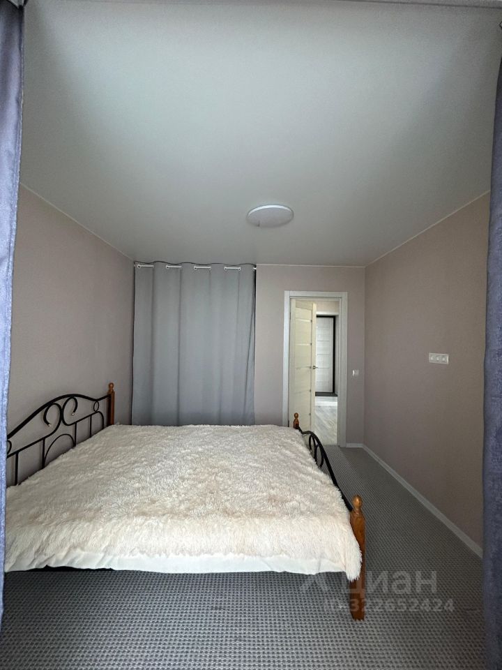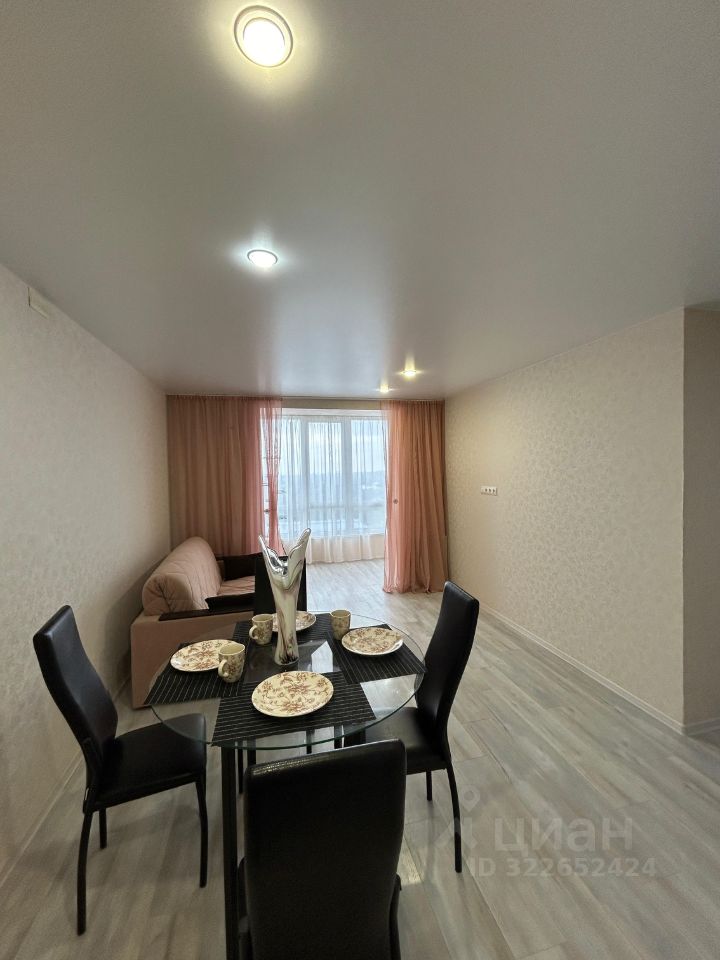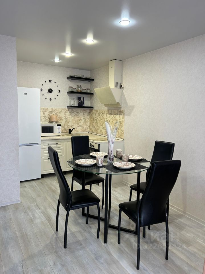 В квартире просторная кухня-гостиная с кухонным гарнитуром, новой духовкой и варочной панелью, холодильником, стеклянным столом со стульями и комфортным диваном. Спальня оборудована встроенным шкафом-купе.
