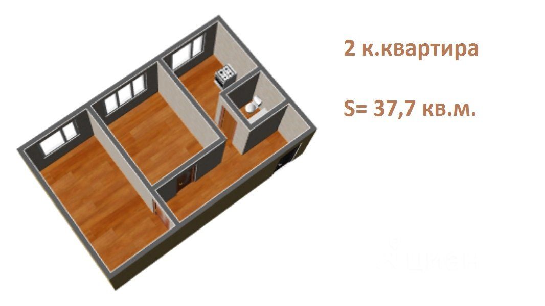 Площадь квартиры 37,7 кв.м. с двумя изолированными комнатами