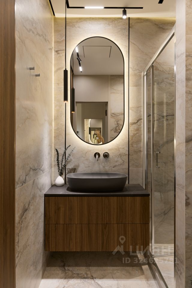 Дизайнерская мебель премиум уровня во всех помещениях: эмалированные встроенные шкафы с подсветкой и продуманная до мелочей кухня, шпонированные орехом тумбы, столы из массива дуба и натурального мрамора