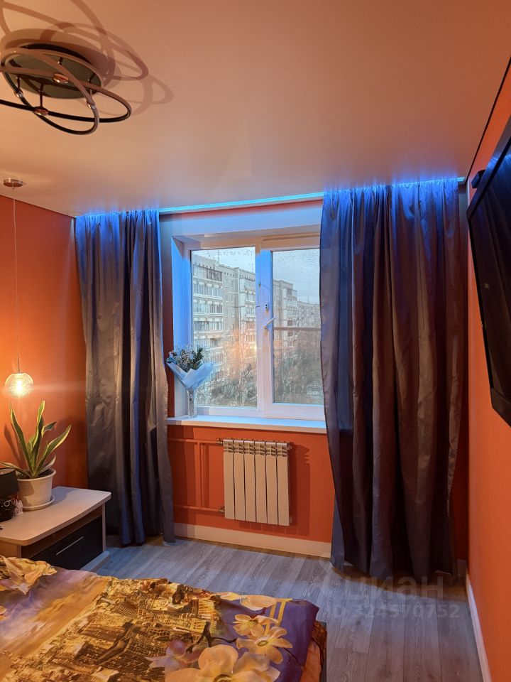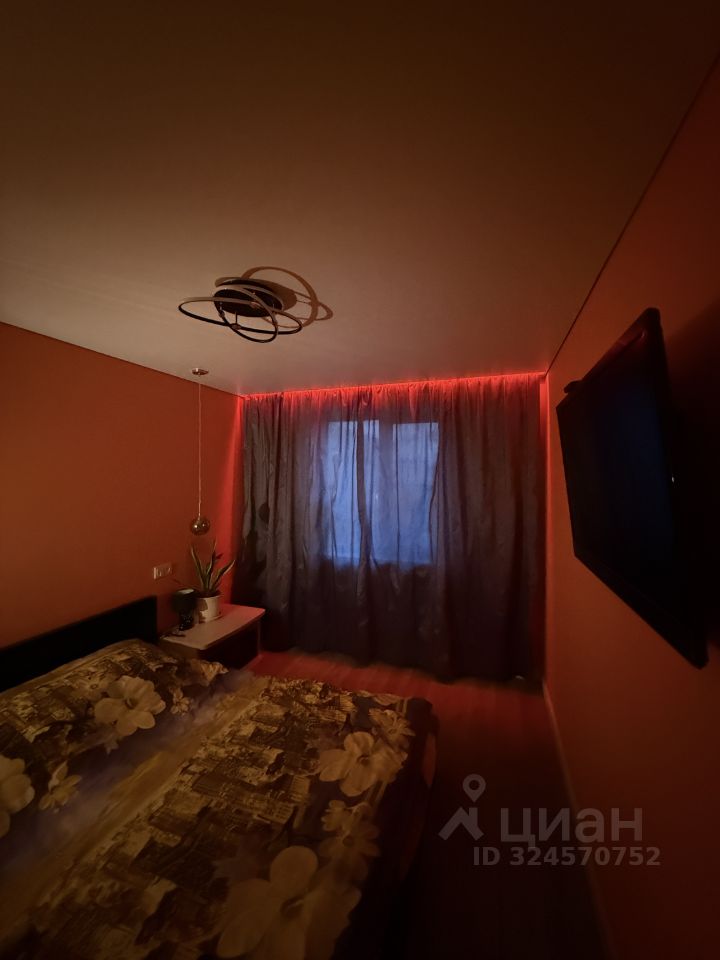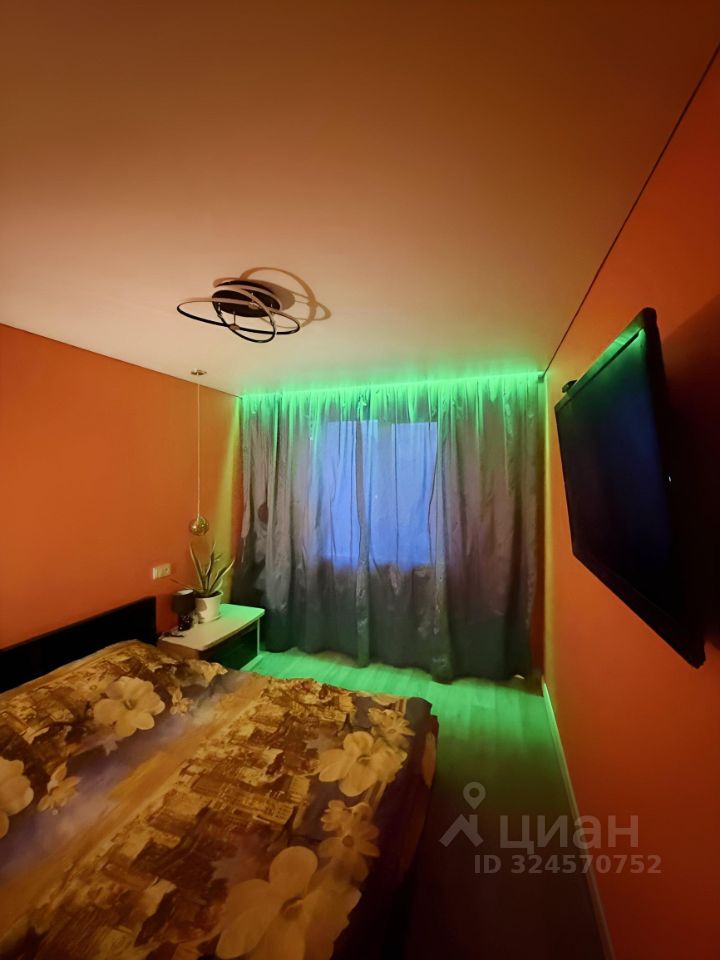 - Спальня с натяжным потолком, регулируемой подсветкой гардины с изменением цвета
