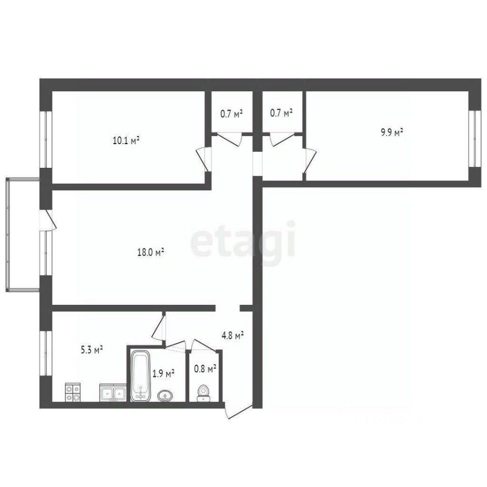 Комнаты: 18 кв.м; 10.1 кв.м; 9.9 кв.м