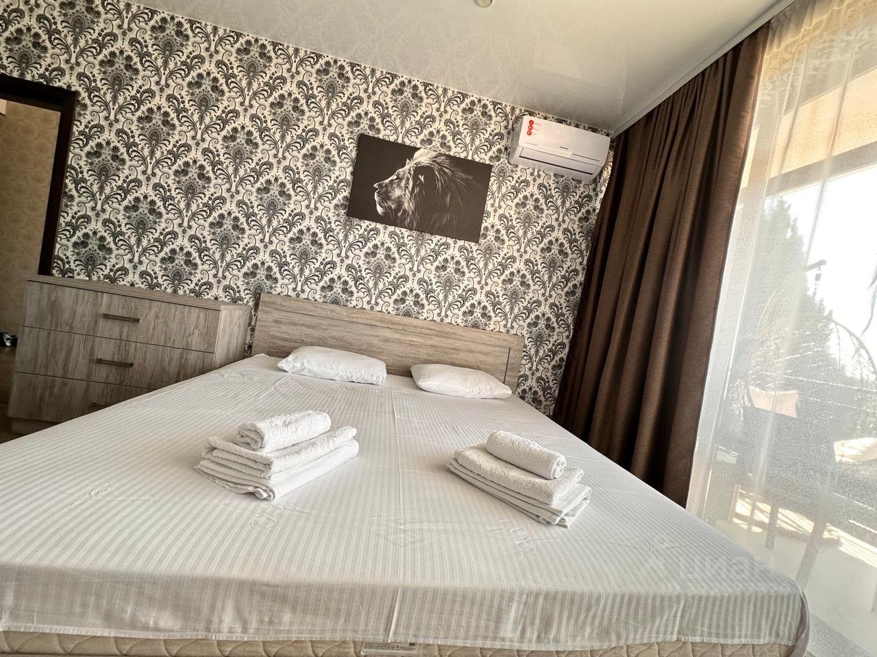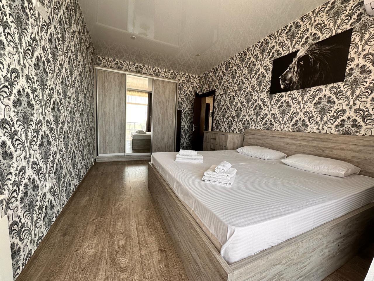 Двухкомнатный Люкс номер с огромный ванной комнатой. Обе комнаты с балконом с видом на море. В спальне кровать Кинг сайз, большой шкаф купе. Во второй комнате раскладной диван, комод, холодильник, телевизор чайник, комплект посуды. Во всех комнатах сплит система. Своя управляющая компания.