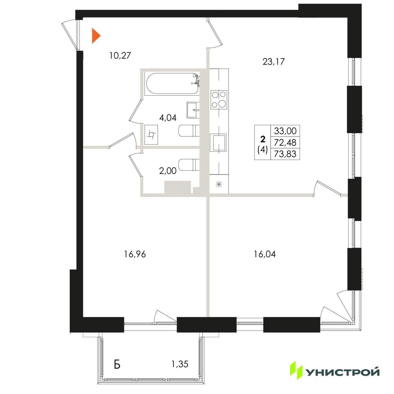 Продается 2-комн. квартира, площадью 73.83 м2. Жилая площадь 33 м2, кухня 23.17 м2. Площадь комнат: 16.96/16.04 м2. Раздельных санузлов - 1. Квартира располагается на 2 этаже 5-этажного дома в...
