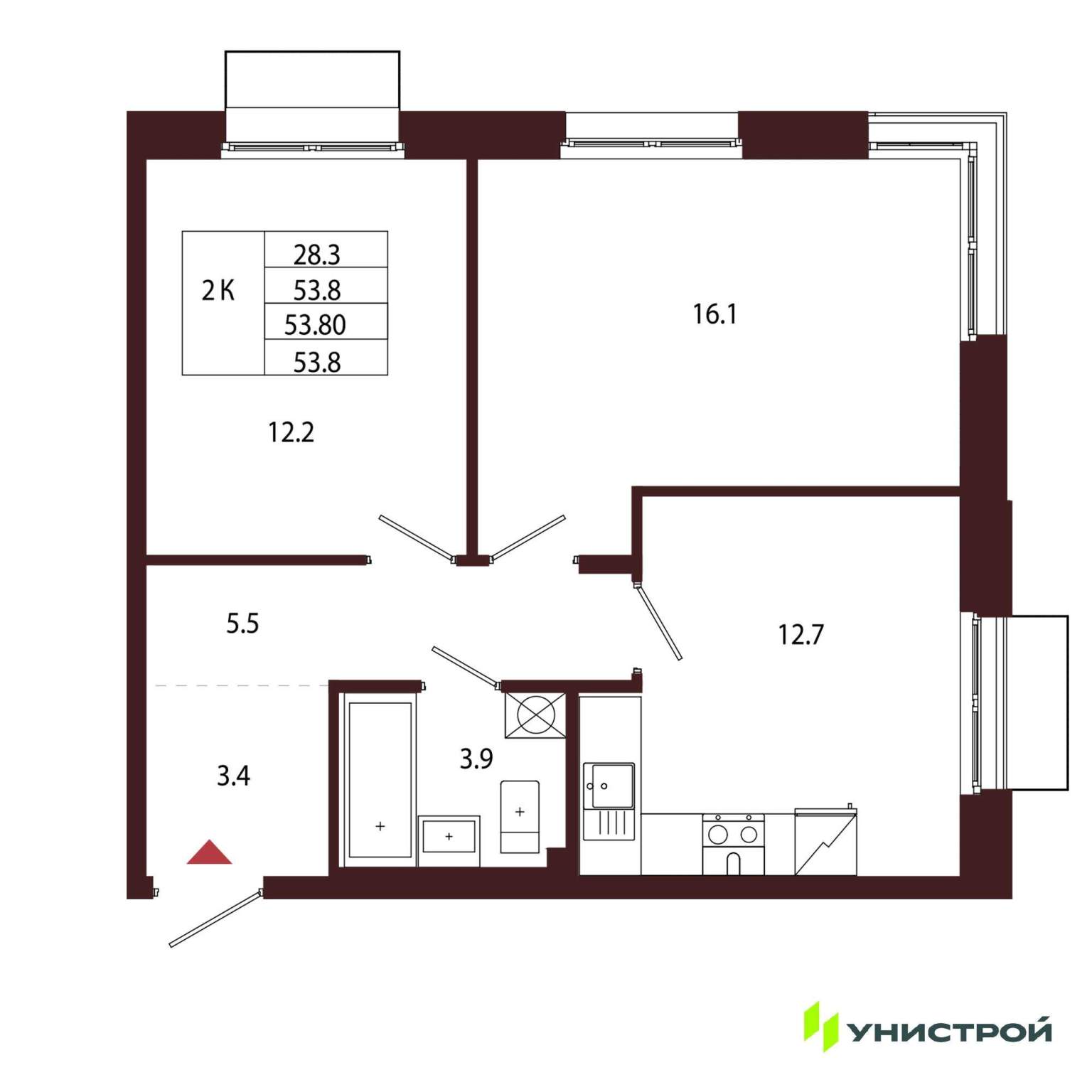 Продается 2-комн. квартира, площадью 53.8 м2. Жилая площадь 28.3 м2, кухня 12.7 м2. Площадь комнат: 12.20/16.10 м2. Раздельных санузлов - 1. Квартира располагается на 2 этаже 5-этажного дома в...