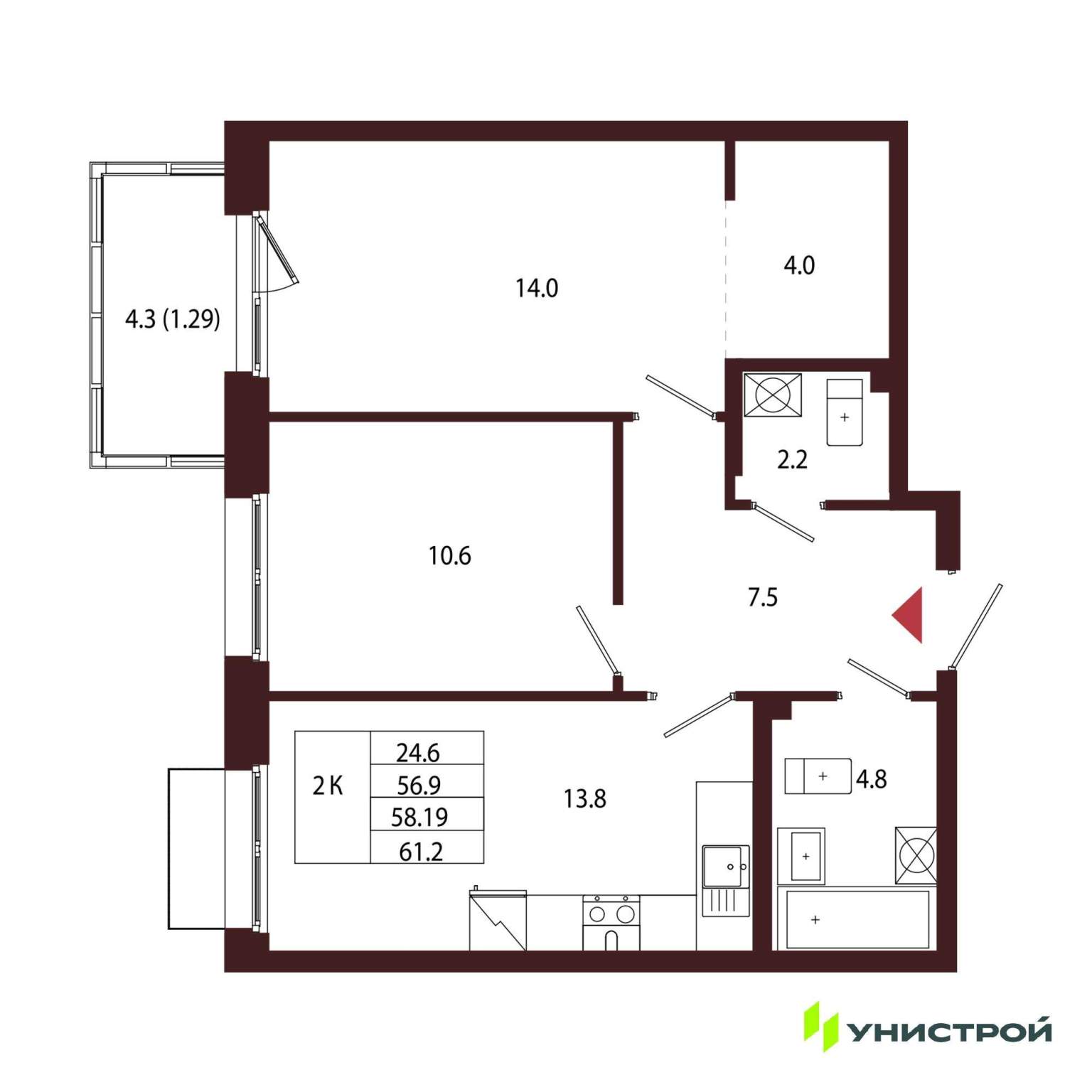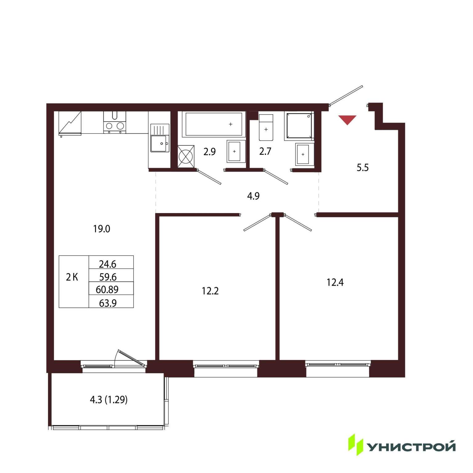 Продается 2-комн. квартира, площадью 60.89 м2. Жилая площадь 24.6 м2, кухня 19 м2. Площадь комнат: 12.40/12.20 м2. Раздельных санузлов - 1. Квартира располагается на 2 этаже 5-этажного дома в ЖК...