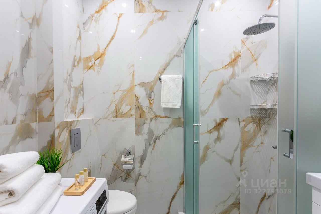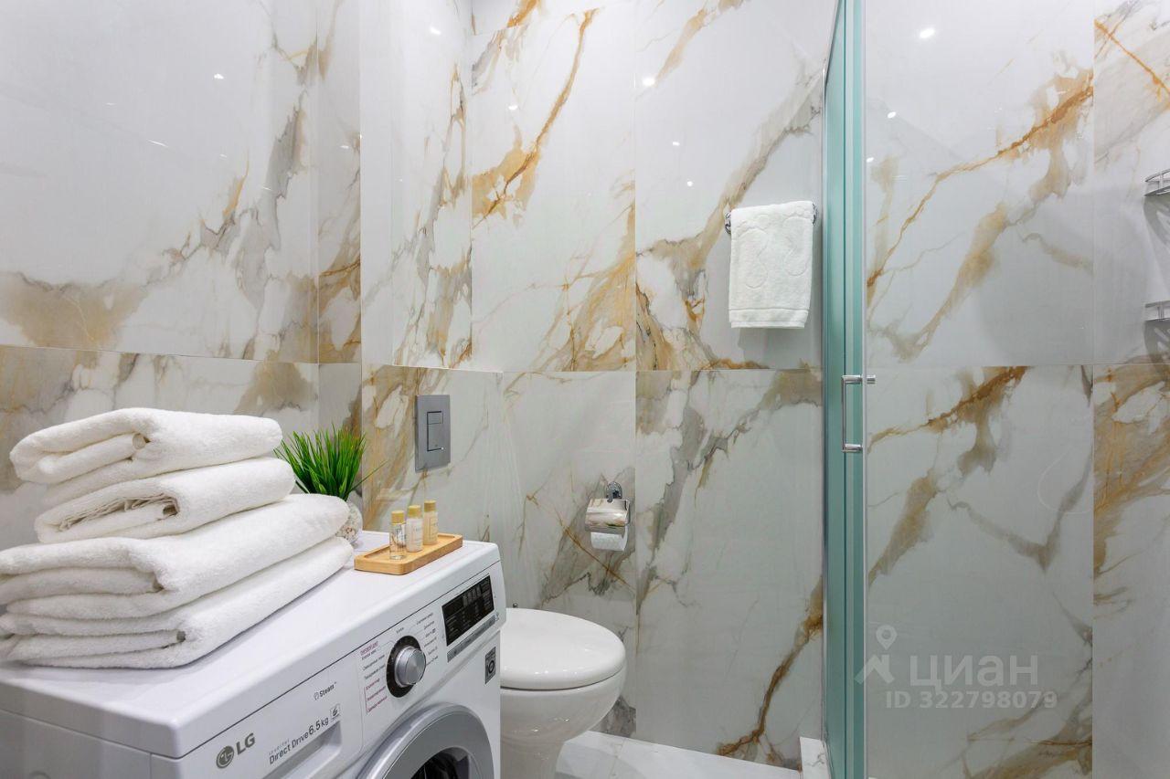 • Санузел с душевой, раковиной с зеркалом, унитазом и стиральной машиной.