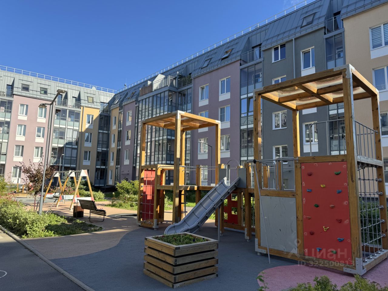 с детской площадкой, круглосуточной охраной и видеонаблюдением.
