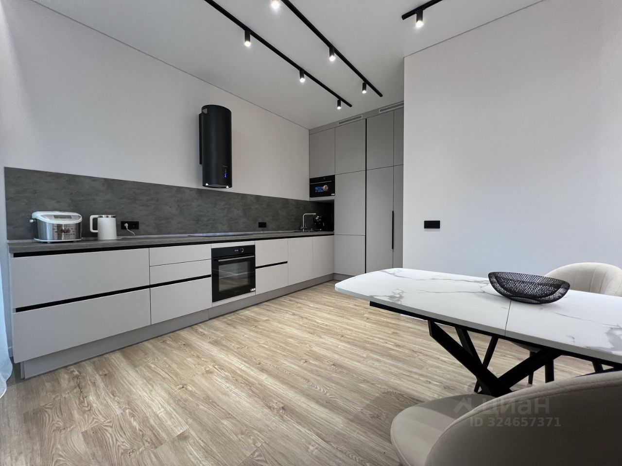 Из техники есть всё необходимое: робот пылесос, кондиционер, посудомоечная машина, стиральная и сушильная машины, плита, духовка, вытяжка, микроволновка, кофеварка, чайник и мультиварка.