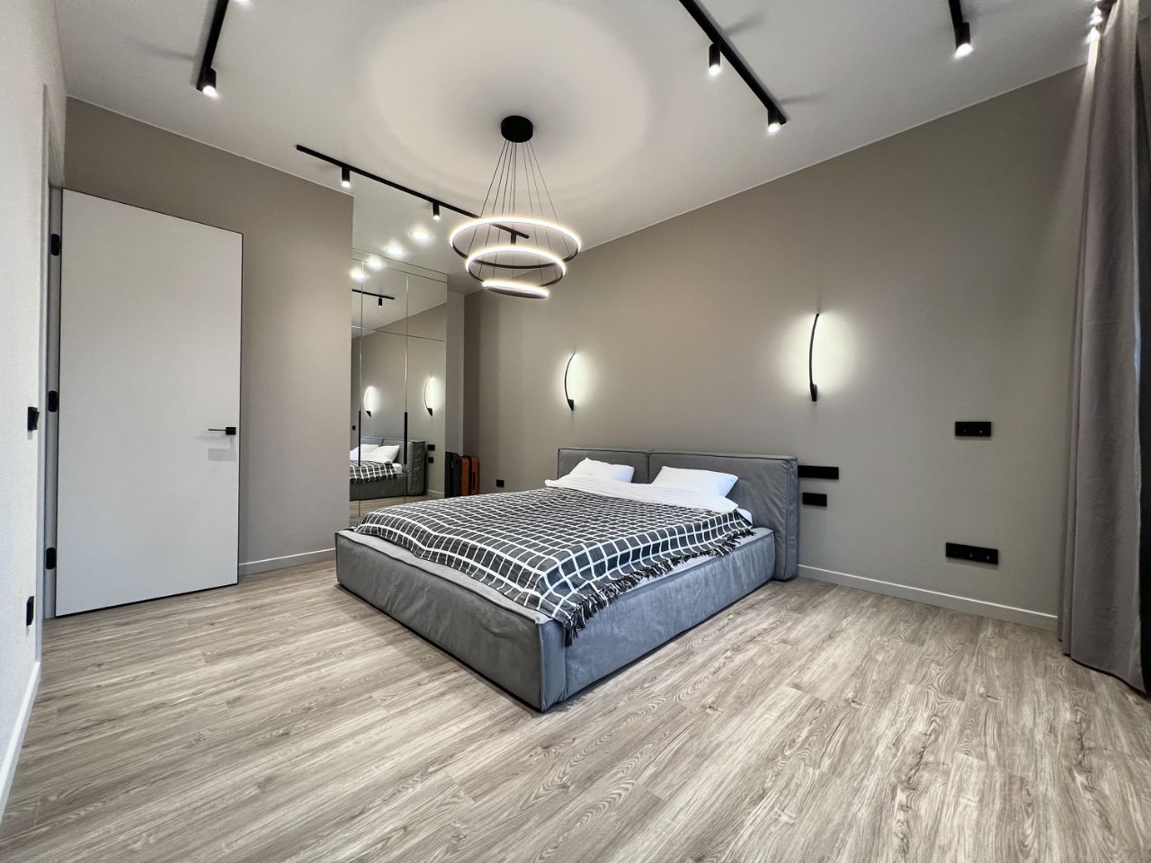 Кухня и мебель выполнены на заказ. Вместительные шкафы — в прихожей, зеркальный в спальне и ещё один в гостиной.