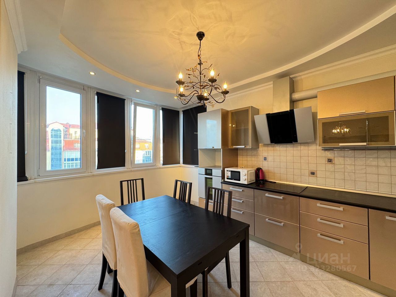 Кухня совмещена с залом. В зале находятся панорамные окна с отличным видом во двор. Из лоджии также открывается классный обзор на район.
