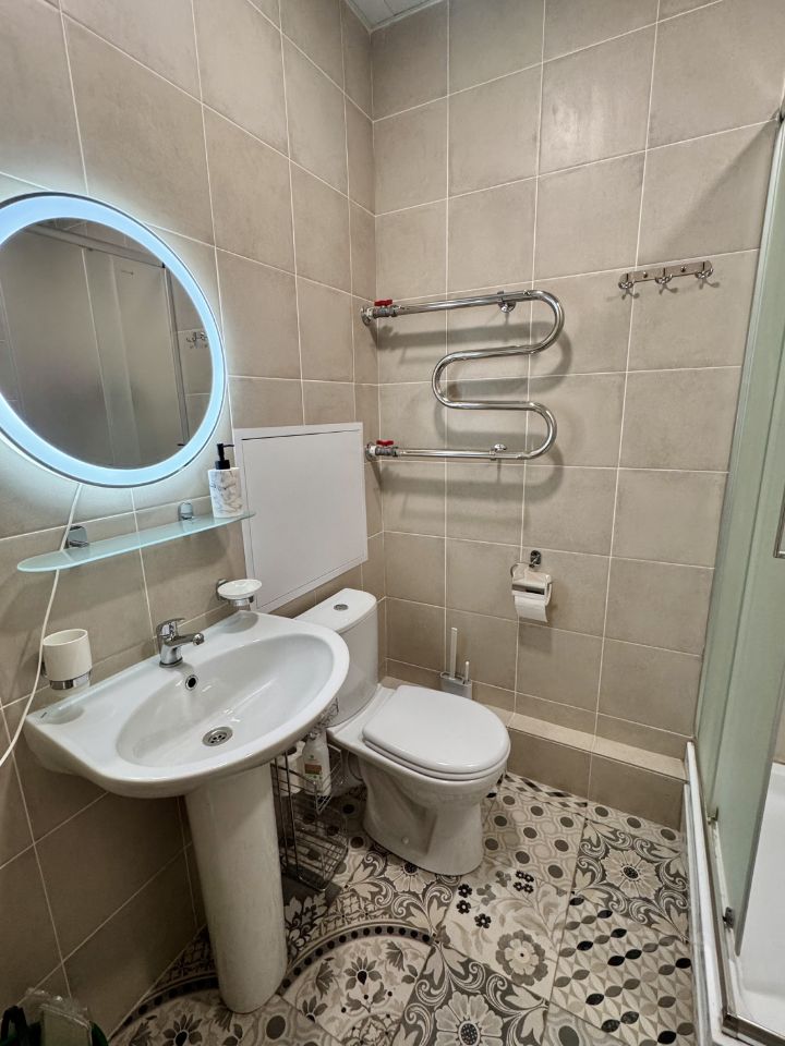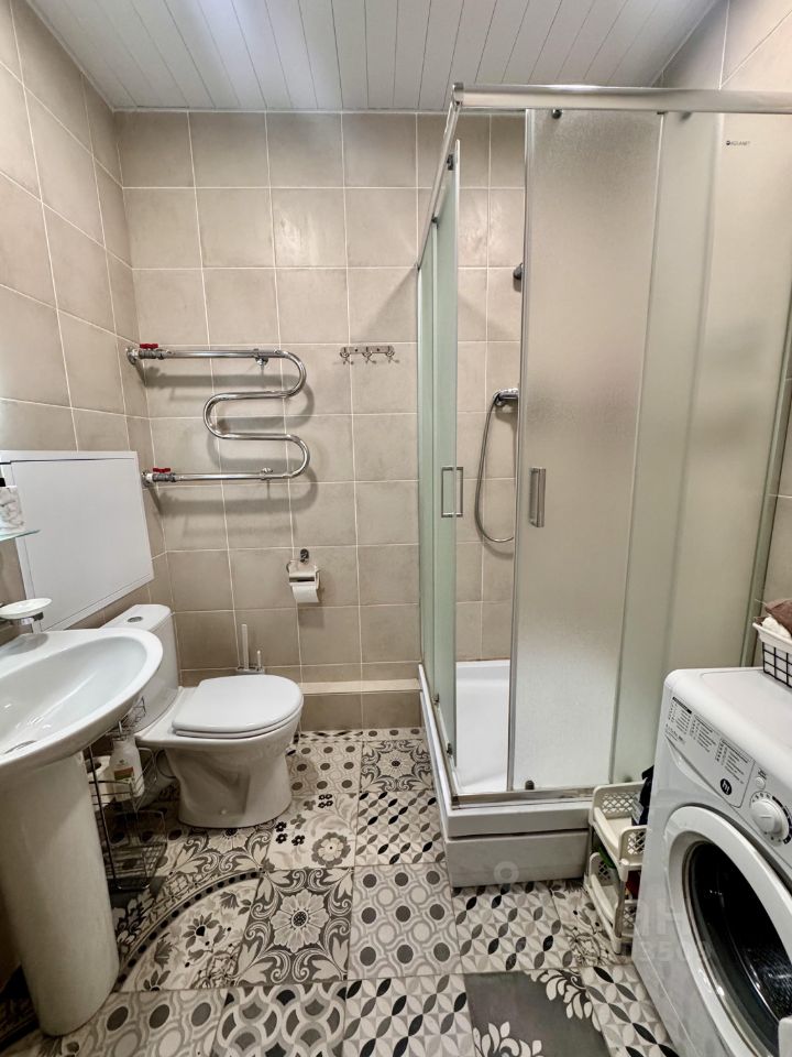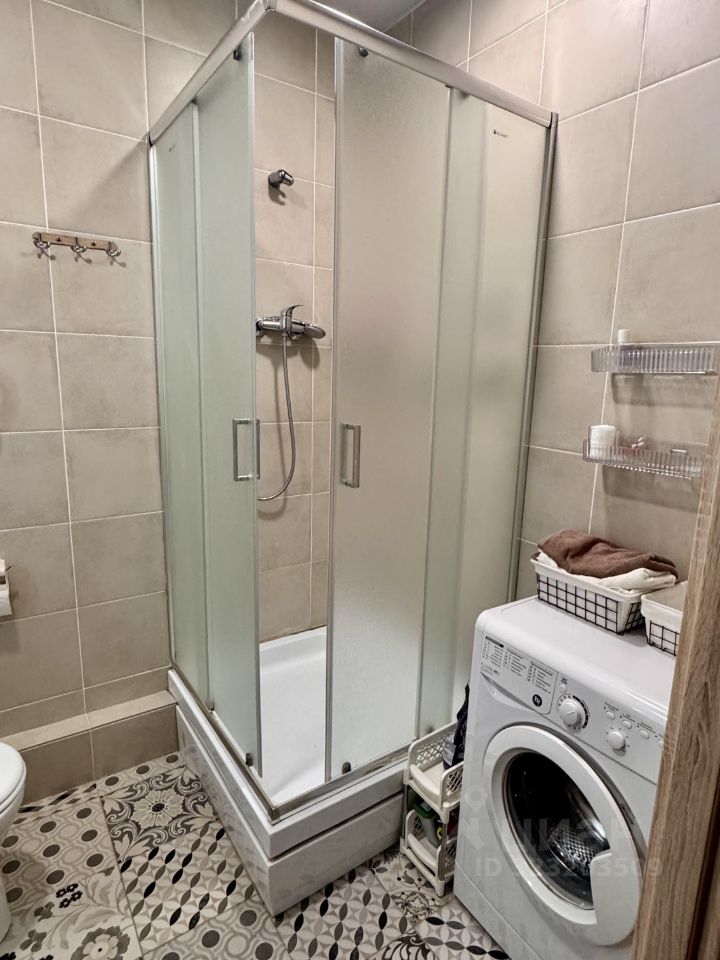 В квартире есть все необходимое для комфортного проживания. Просторная комната с мебелью, оборудованная кухонная зона, а также техника: кондиционер, холодильник, телевизор и стиральная машина. Высокие потолки (2.9 метра) и окно во всю стену создают ощущение простора. Ванная комната оснащена современной душевой кабиной.