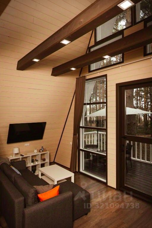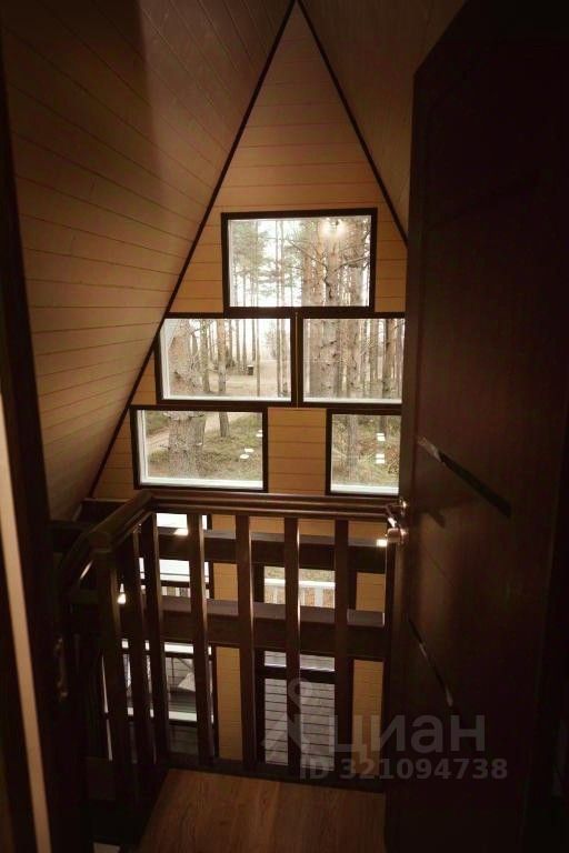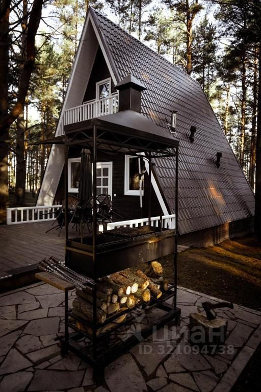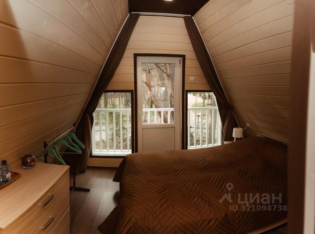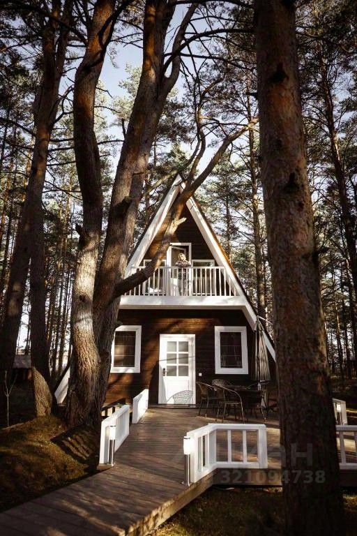 Треугольный двухэтажный коттедж в cтиле A-Frame. Один фасад с панорамным остеклением и видом на Ладожское озеро, другой - с уютным балконом. В коттедже две спальни, гостиная с большим диваном-кроватью, просторная кухня, туалет и ванная комната. Рядом с коттеджем расположены две большие террасы с мангальной зоной.