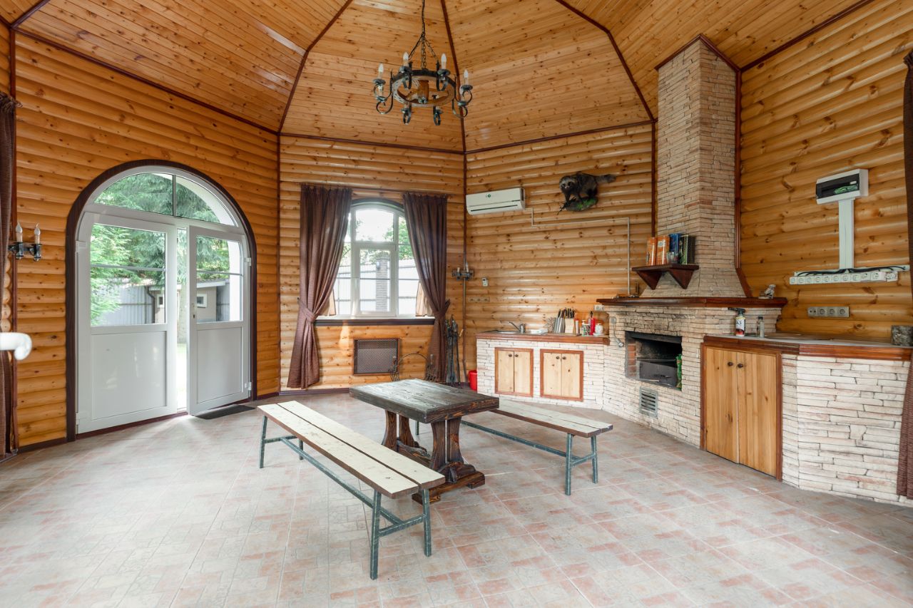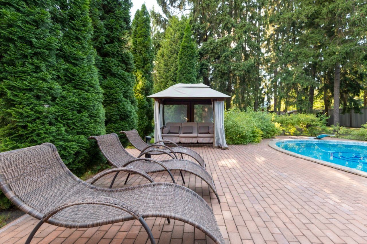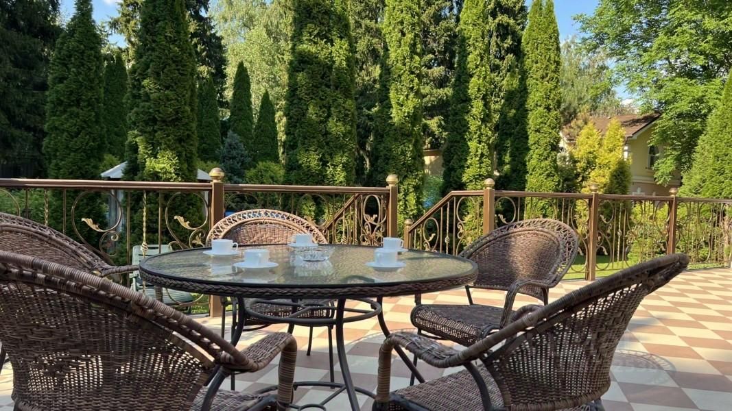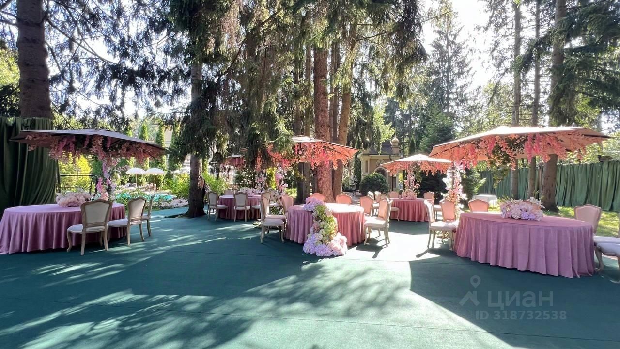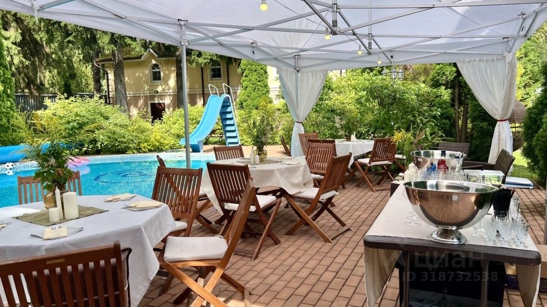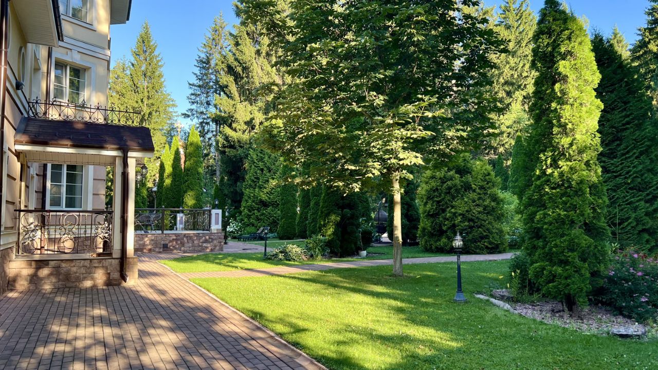 Участок: облагороженный живописный 49 соток. Прилесная зеленая территория с ландшафтным дизайном. Растут хвойные и лиственные деревья. Шезлонги, садовая мебель. По всему участку вымощены дорожки. Закрытая беседка на 20 персон с камином и кондиционером, отапливаемая в холодный сезон. Мангал, лавочка. Рядом с беседкой с/у. Терраса на 60 персон. Часовня. Фонтан. Гараж на 4 автомобиля, парковка на 15 автомобилей. Уличный бассейн. Казан на 10 л.