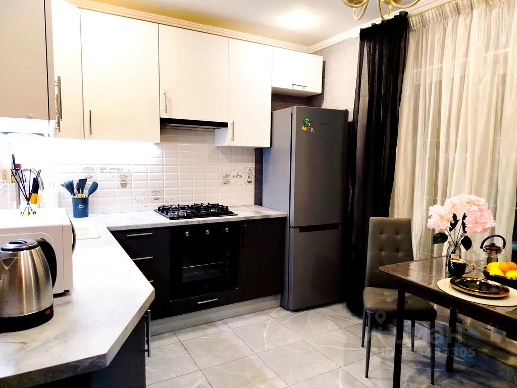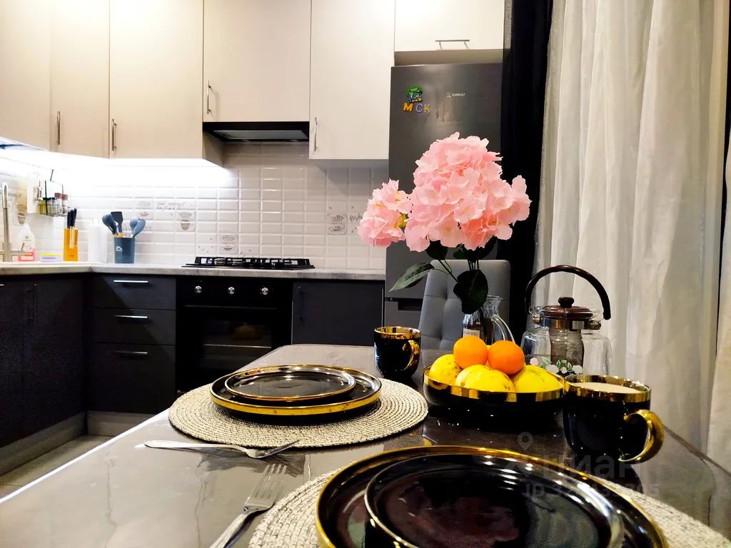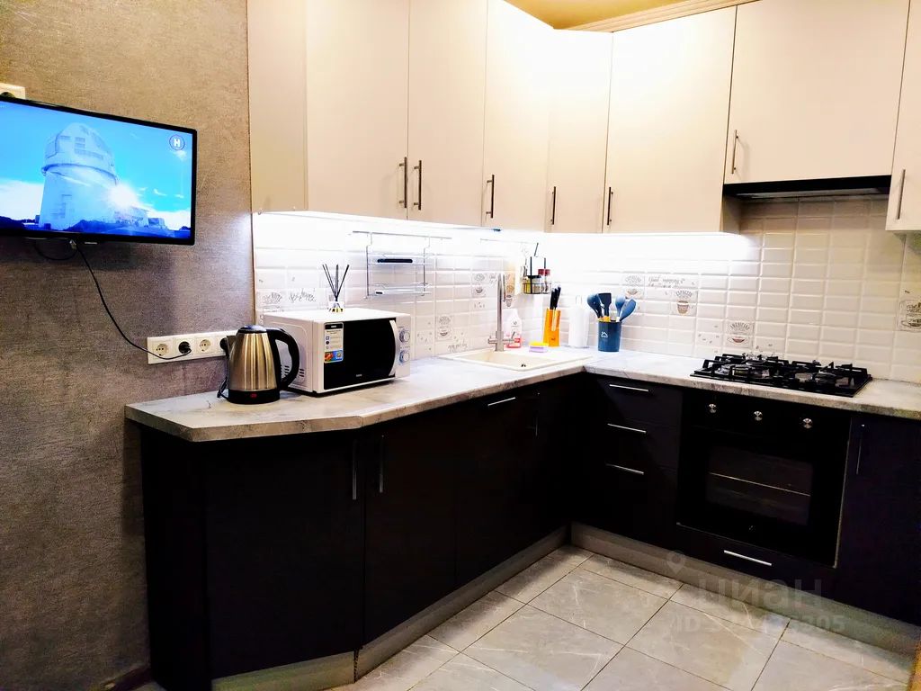 Кухня со всей необходимой бытовой техникой(микроволновка, холодильник, посудомойка, чайник, плита газовая, духовка) и посудой.