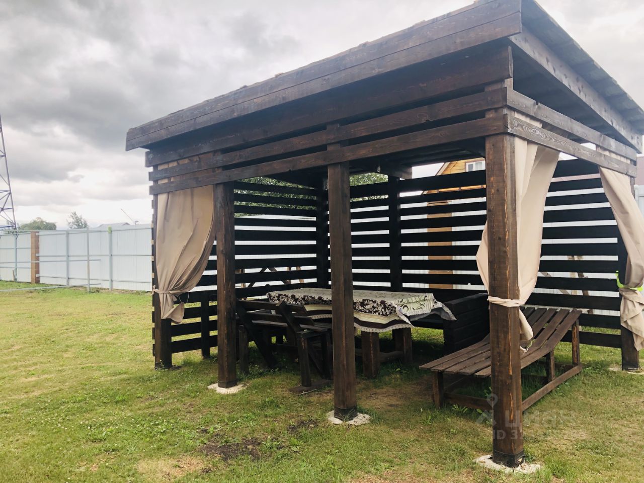 На участке уютная беседка со светом и большим столом