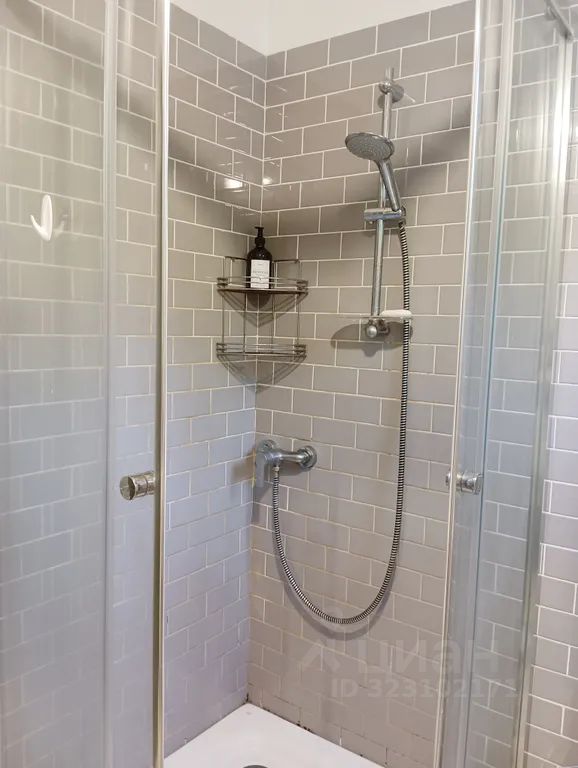 Санузел с душевой кабиной и раковиной.
