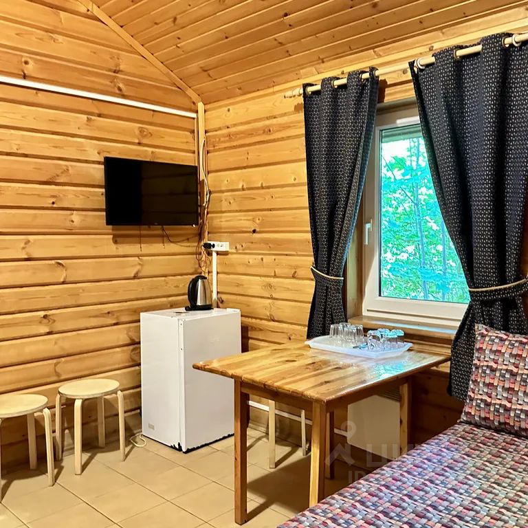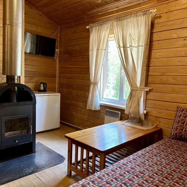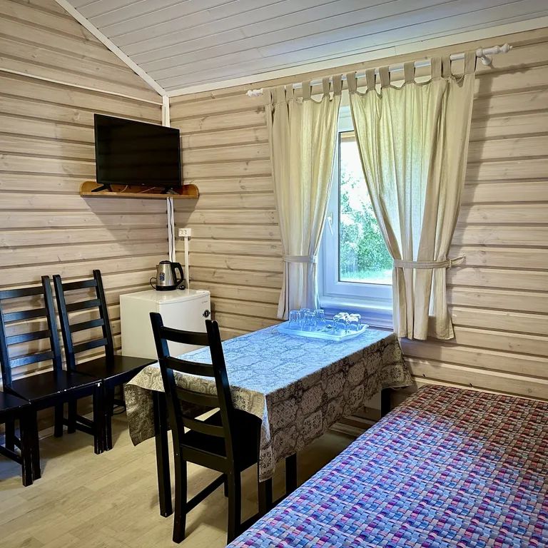 Одноэтажный коттедж с двумя жилыми комнатами, верандой и мангалом на улице. В спальне две односпальные кровати и прикроватные тумбы, в гостиной двуспальный диван-тахта, камин, холодильник, электрочайник, чайная посуда, телевизор, wc и душевая кабина. В стоимость входит уборка коттеджа, постельное бельё, полотенца.